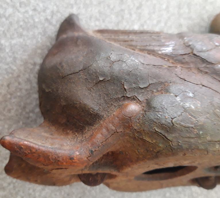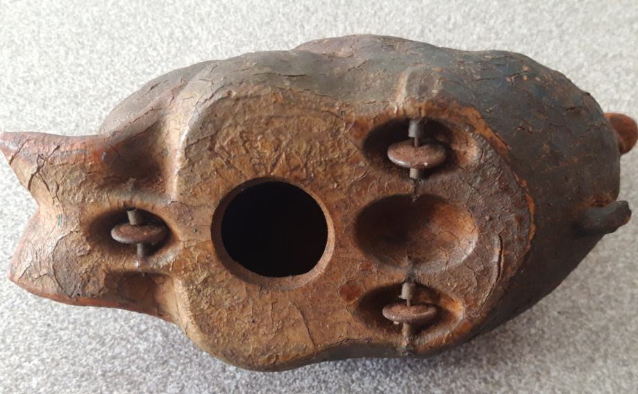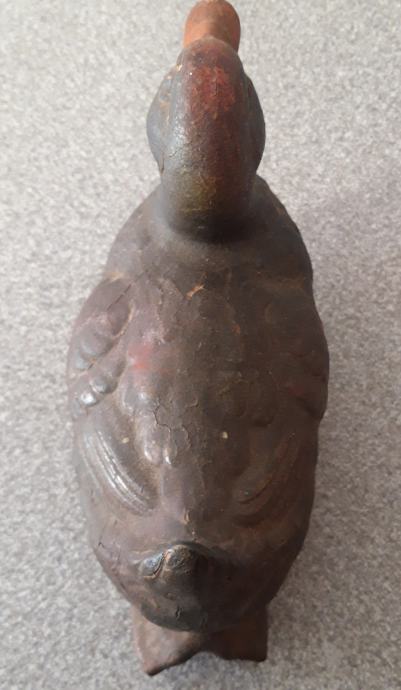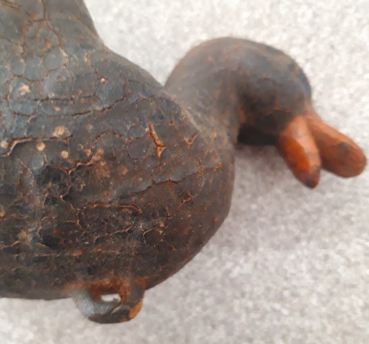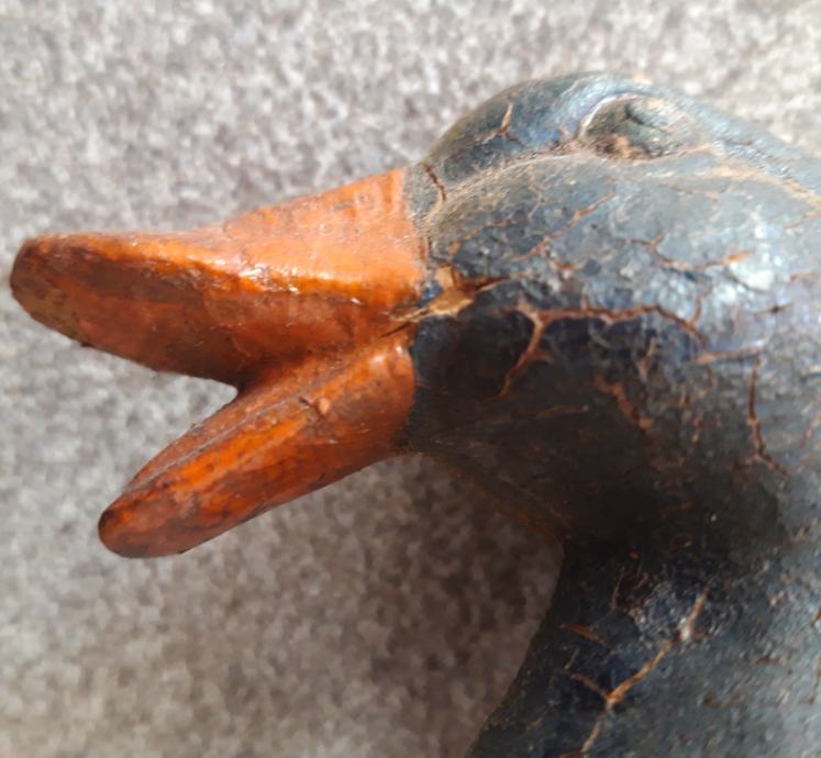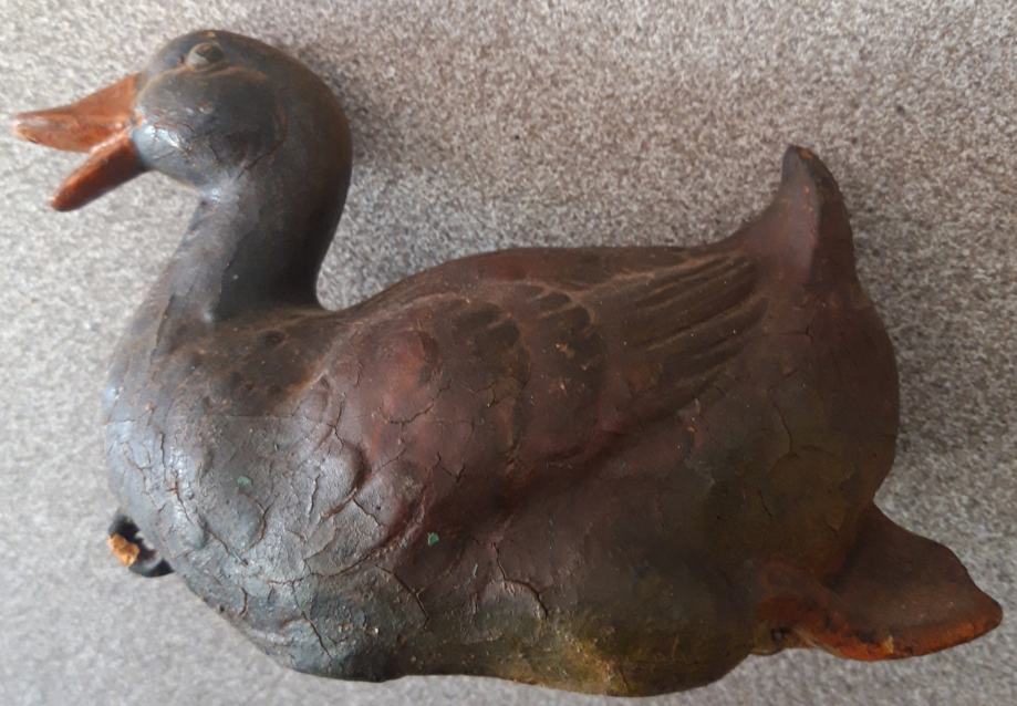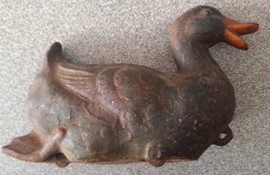 TOČNO SE RADI O IGRAČKI ZA DJECU JER JE VIDLJIVA RUPICA ISPOD GLAVE PATKE,GDJE SE VEZAO NEKI ŠPAG (KONOP )TAKO DA BI DIJETE ISTU MOGLO VUČI JER ISPOD IMA 3 METALNA KOTAČIĆA KOJI SU I DANAS U FUNKCIJI.NEKAD DAVNO NEKI RODITELJ ILI ROĐAK, PRIJATELJ KUPIO JE IGRAČKU DJETETU.TAD IGRAČKA,DANAS ISTO TAKO ALI PUNO ZNAČAJNIJA I VAŽNIJA A POGOTOVO SKUPLJA.KADA BI IGRAČKU OCJENJIVALI OD 1 DO 10, UOPČE NE DVOJIM DA BI BILA OCJENJENA ČISTOM DESETKOM.