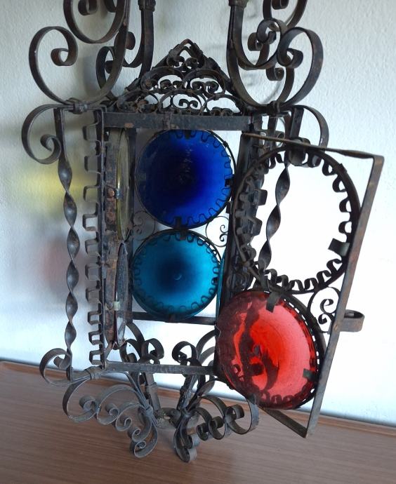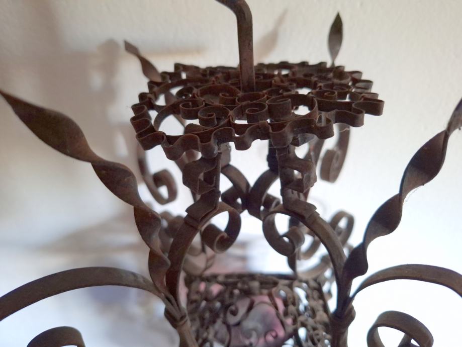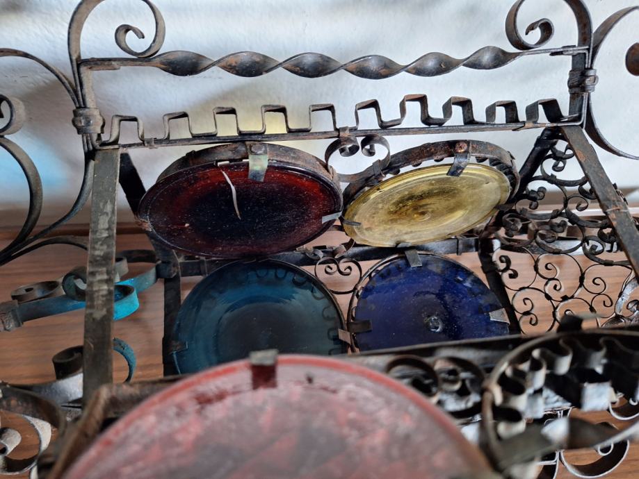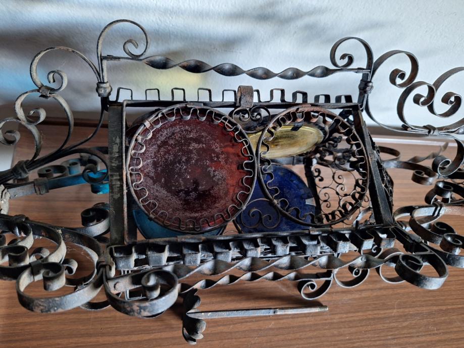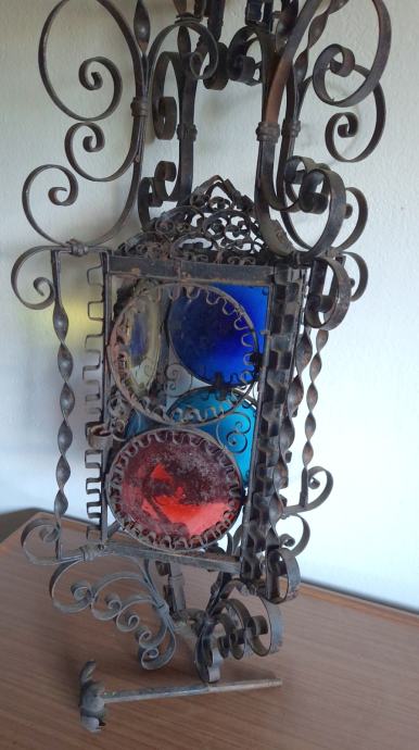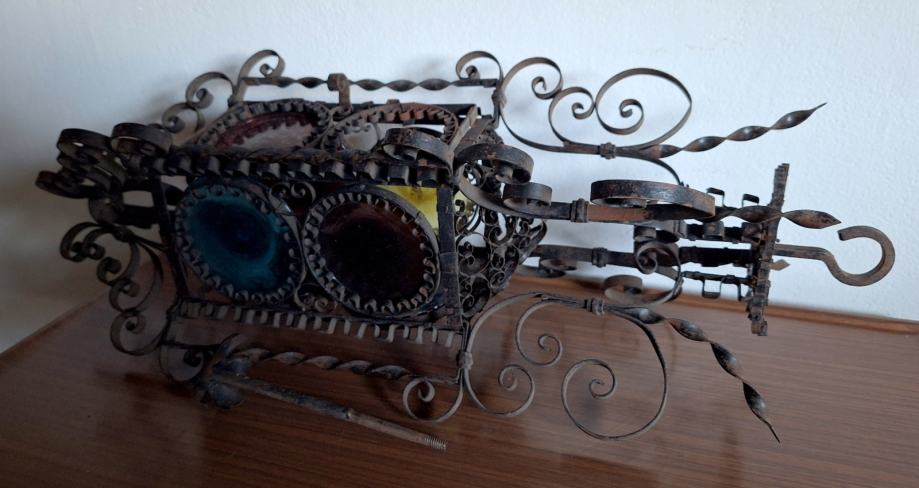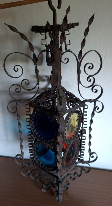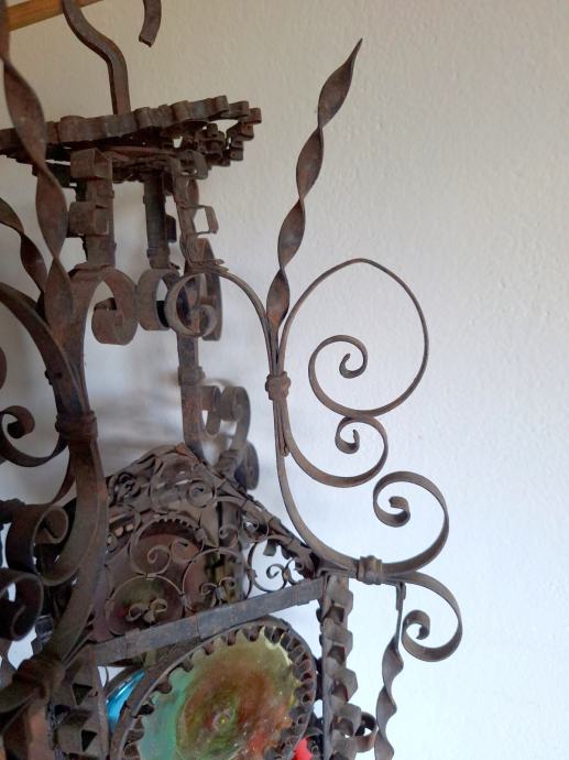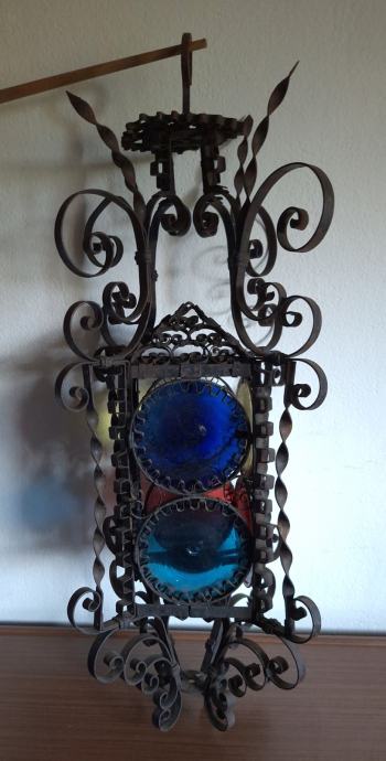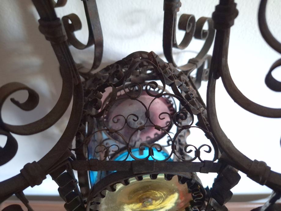 Unikatni viseći svijećnjak, potrebna restauracija (nedostaje jedno staklo, jedno je razbijeno), ručno izrađen iz doba Austro-Ugarske monarhije, 60x29 cm, težina 2200 grama, detalji i cjelokupno stanje vidljivi na slikama...