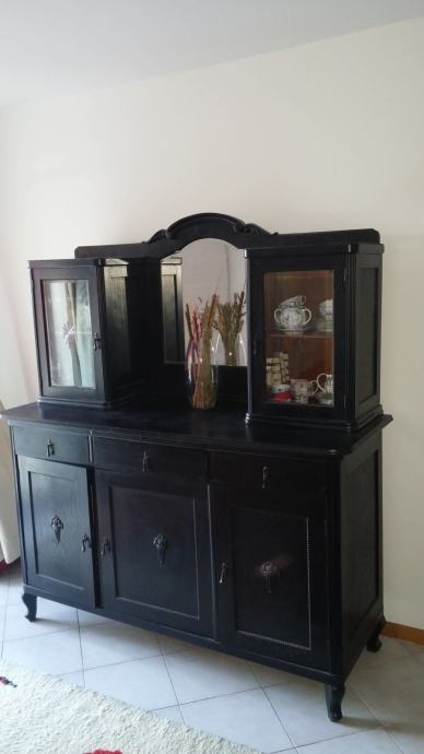 Prodajem Komplet od 3 elementa:vitrina (vidljiva na slikama), kvadratni stol i mala komoda za televiziju ili slično( šaljem slike na upit). puno drvo hrast bajcan u crno.