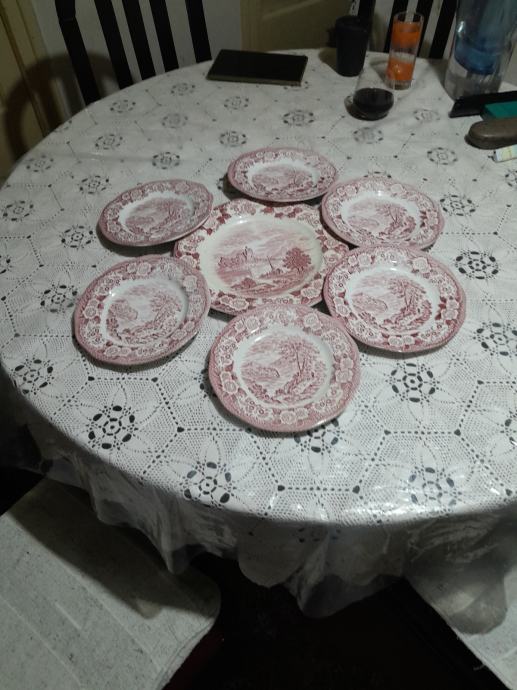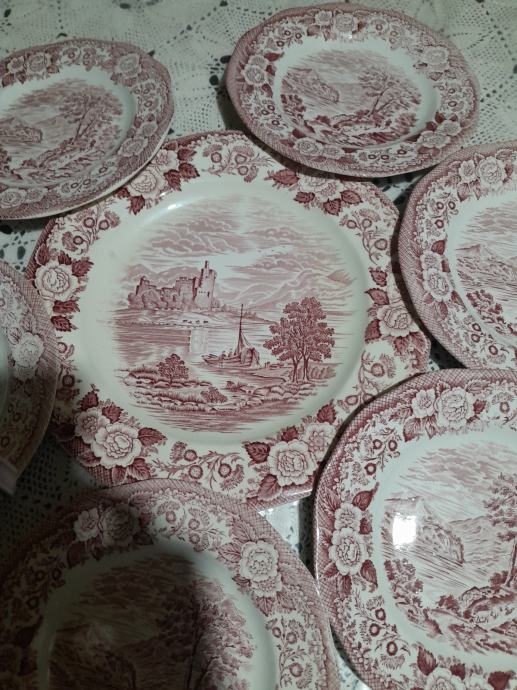 Šest očuvanih desertnih tanjurića promjera 20 cm I jedan veliki promjera 28 cm od porculana. Marka ENOCH WEDGWOOD, LOCHS OF SCOTLAND. Podrijetlo Englenska