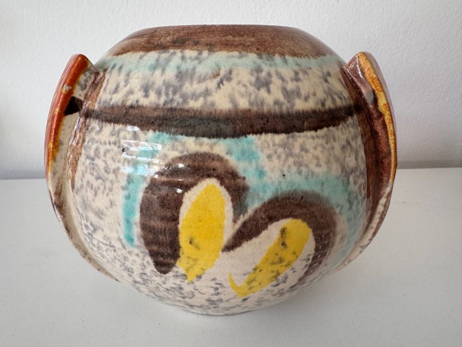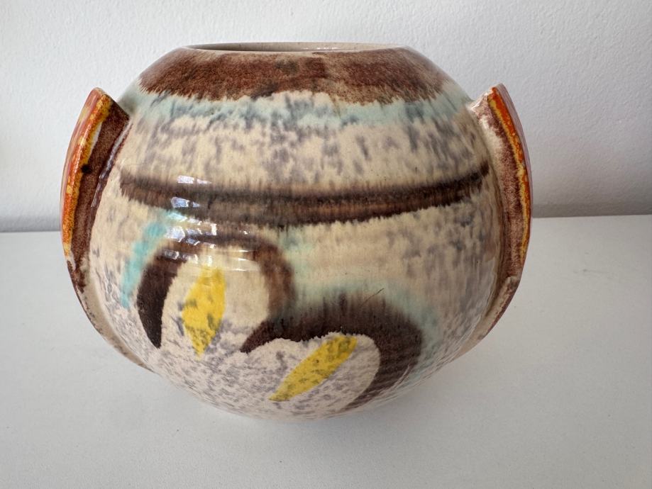 Autentičan njemački komad iz 1930-ih / 1940-ih godina u prepoznatljivom Bauhaus / Art Deco stilu s karakterističnom tekućom glazurom (Laufglasur). Model 111B jedna je od klasičnih Fohr formi – skladna kuglasta silueta s bočnim aplikacijama i ručno izvedenom dekoracijom.