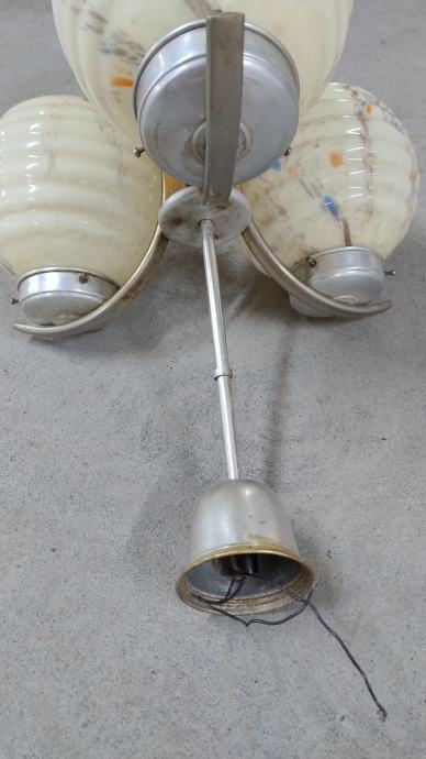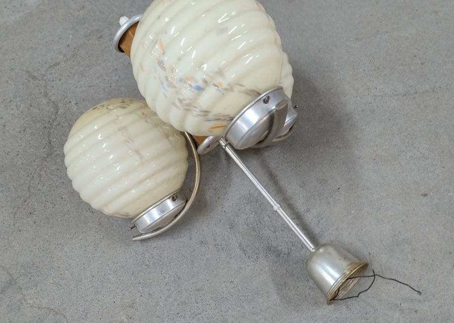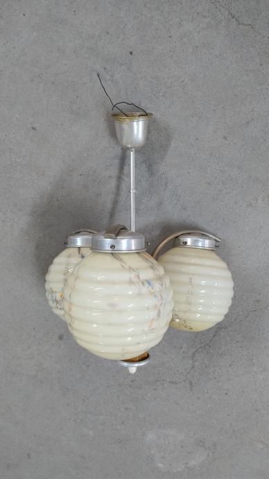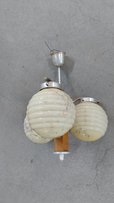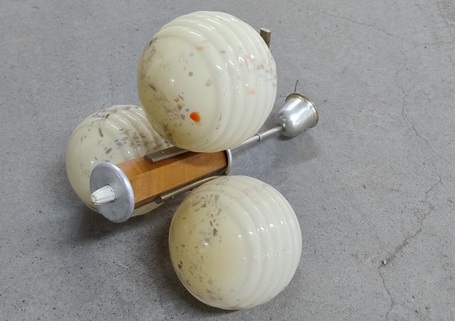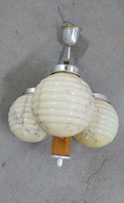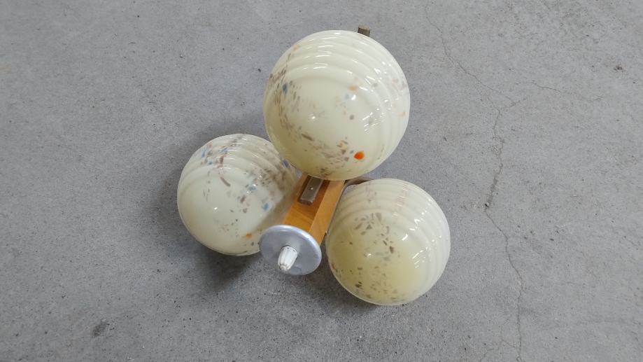 Stari art deco stropni luster sa 3 kugle od opalnog stakla i drvenim tijekom iz 1949.-tih godina. Materijal: drvo, opalno staklo, aluminij. Stanje: sačuvano, neoštećeno.