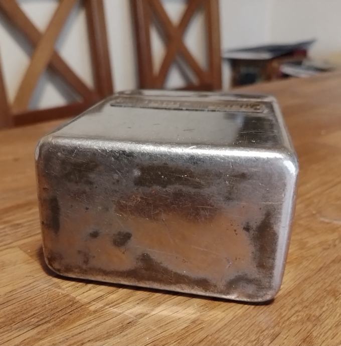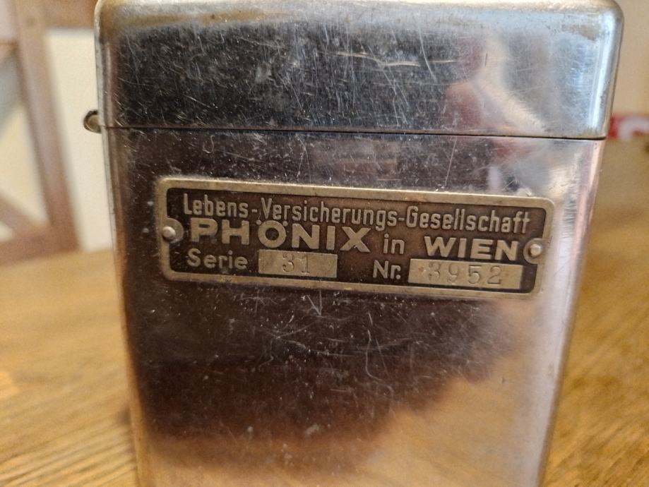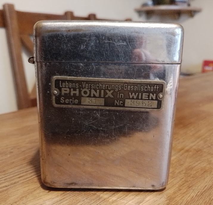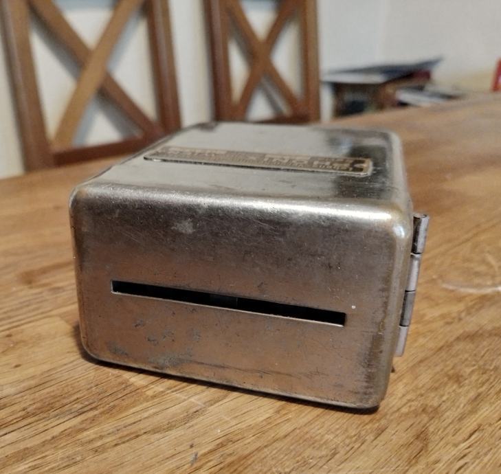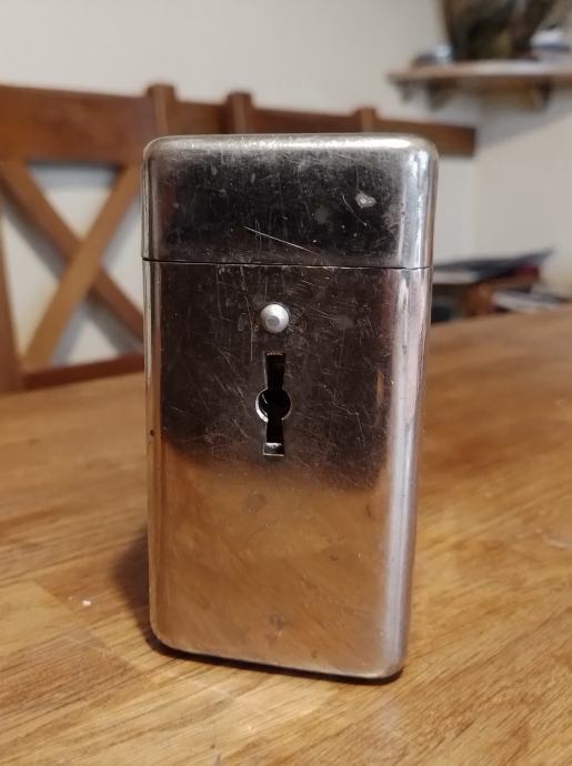 Visina 10.5cm,širina 8.5cm,debljina 5.5cm.Kljuć nema(bankovne kasice se otvaraju u banci).Dobar kolekcionarski primjerak