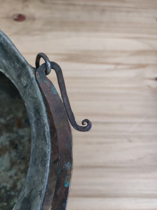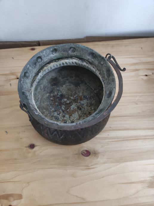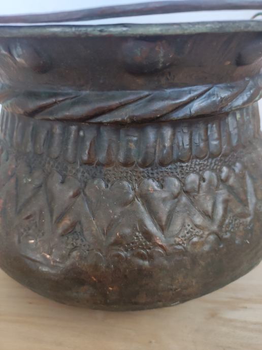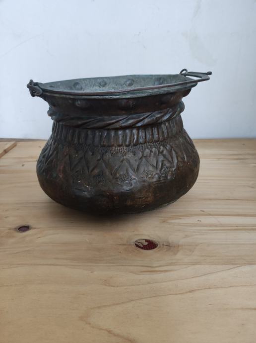 Prodajem stari, ukrasni bakreni lonac, ručni rad, dimenzije 22 š, 16 v. Na loncu vidljivi ukrasni ornamenti.