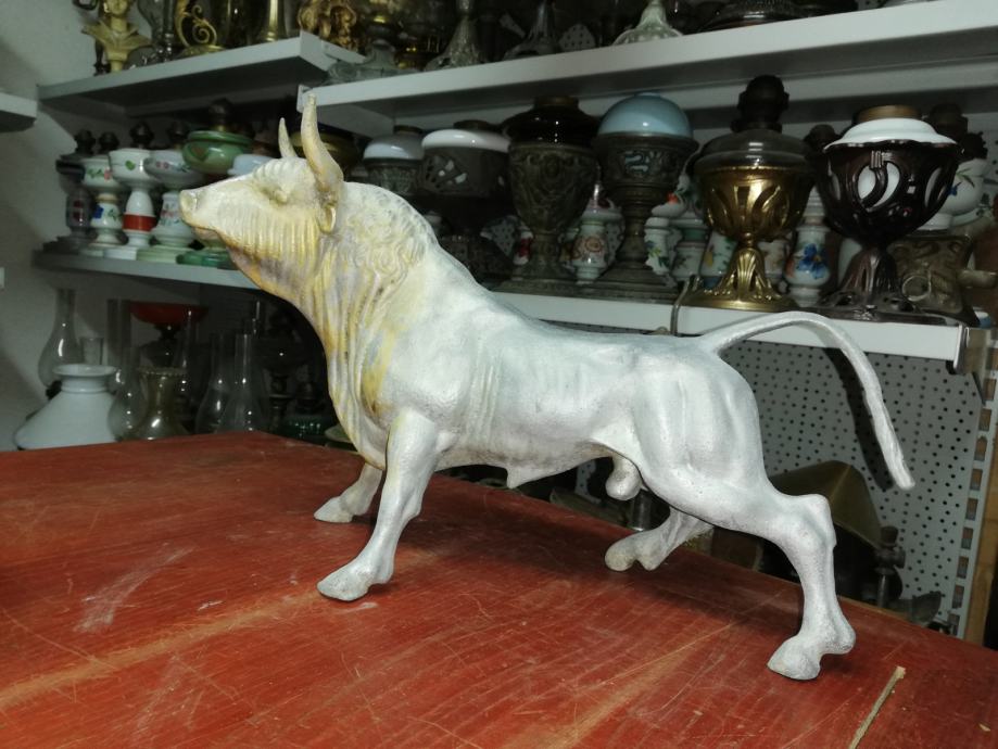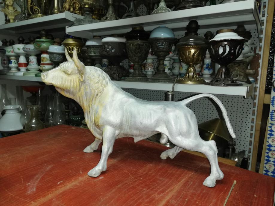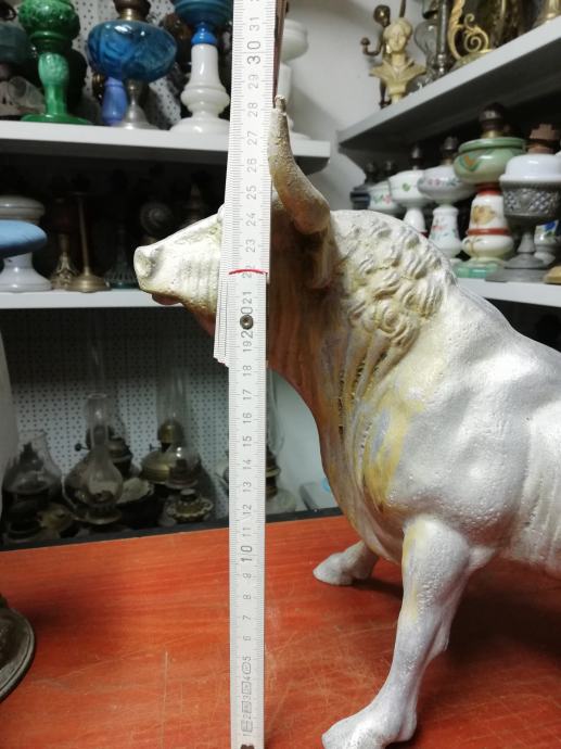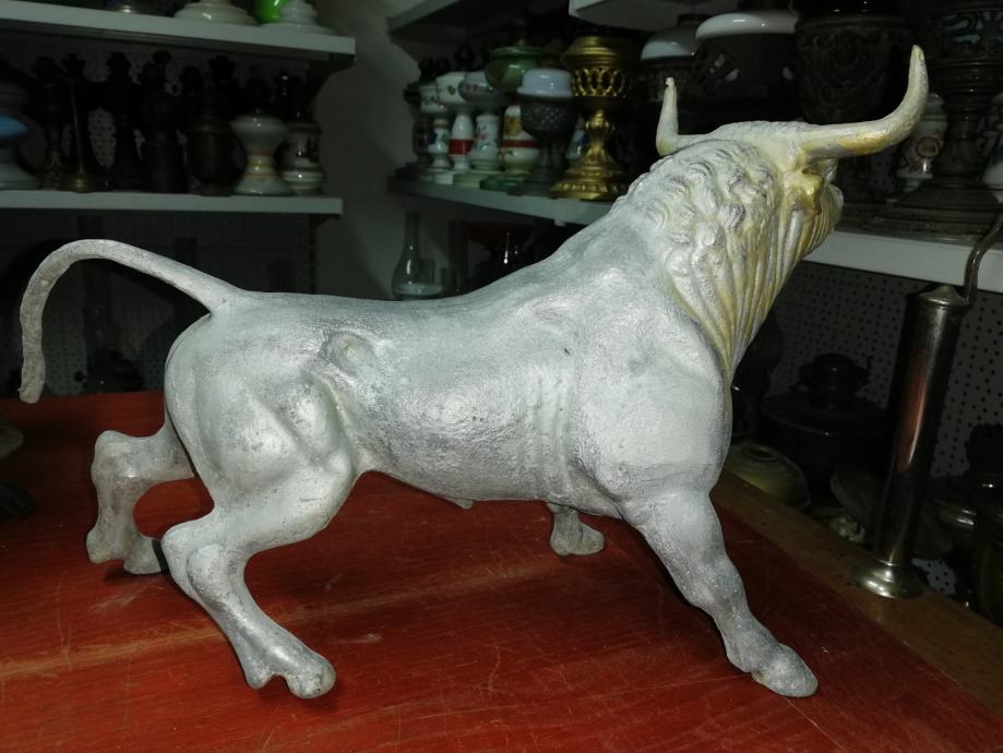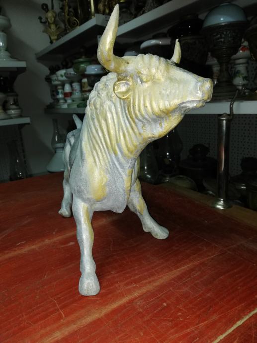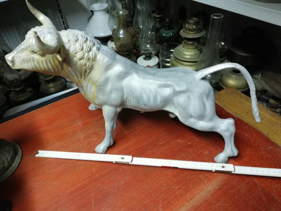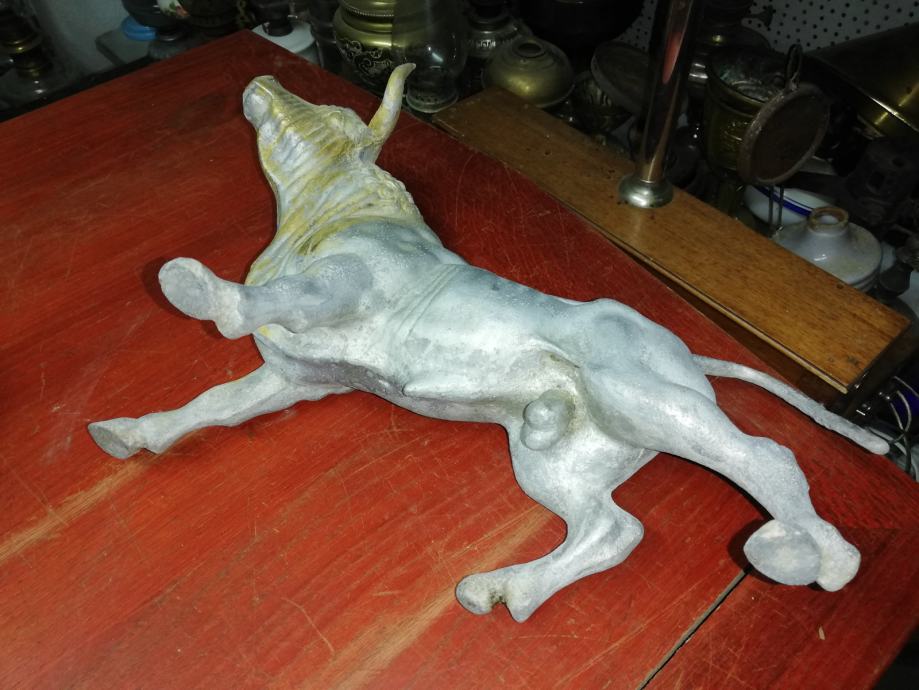 Velika figura bika . Materijal:unutrašnji materijal željezo, vanjski aluminij. Figura je teška preko 8 kg. U odličnom stanju, neoštećena. Dimenzije na fotki. Figura je stajala u jednoj staroj mesnici kao ukras na polici, kako su se inače tada i označavale mesnice. Figura datira iz 1920.tih godina.