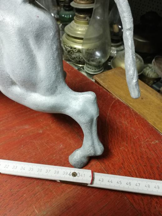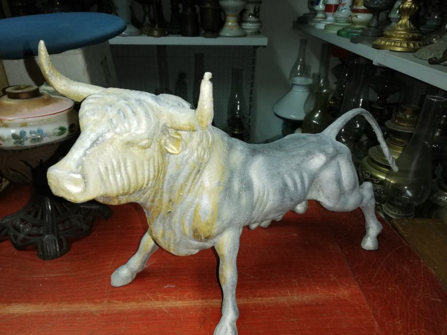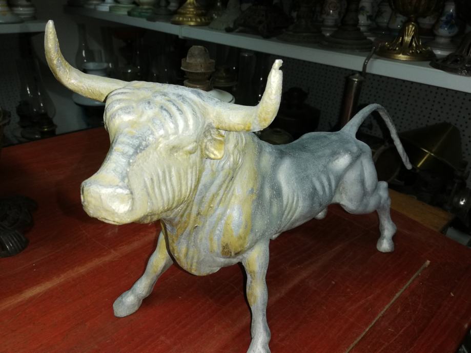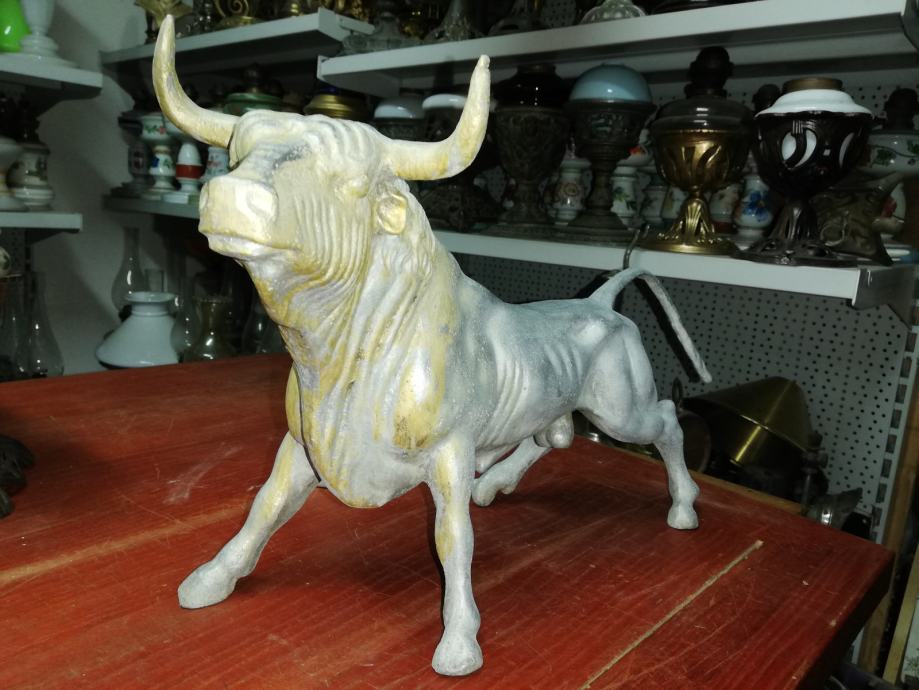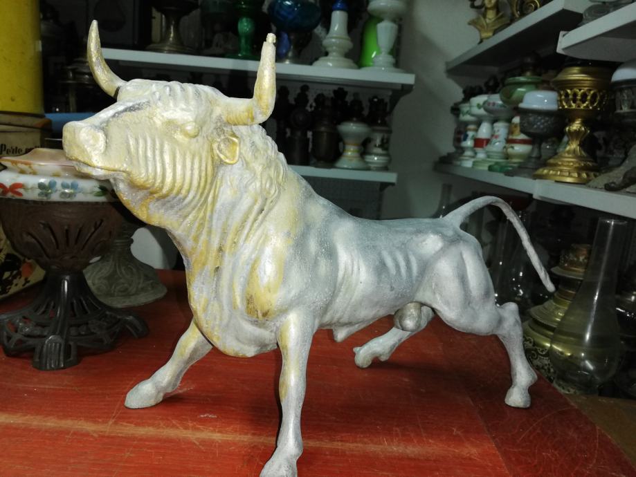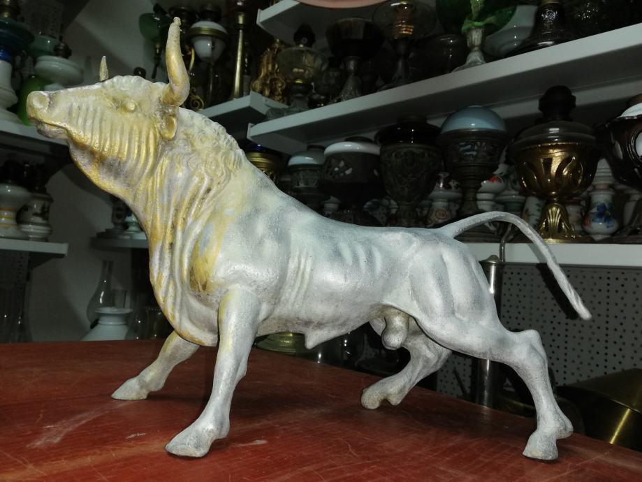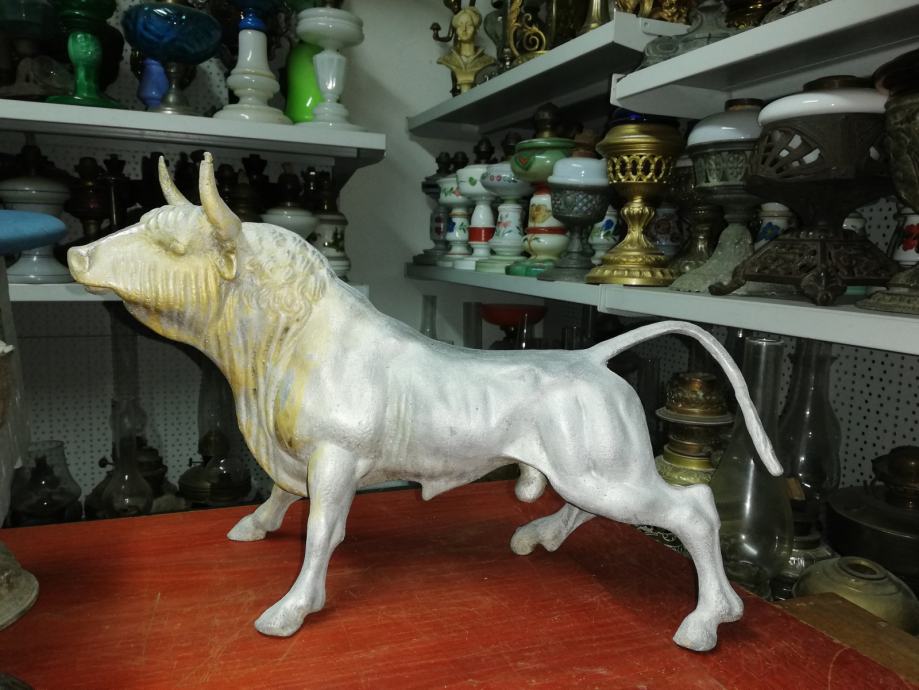 Velika figura bika . Materijal:unutrašnji materijal željezo, vanjski aluminij. Figura je teška preko 8 kg. U odličnom stanju, neoštećena. Dimenzije na fotki. Figura je stajala u jednoj staroj mesnici kao ukras na polici, kako su se inače tada i označavale mesnice. Figura datira iz 1920.tih godina.