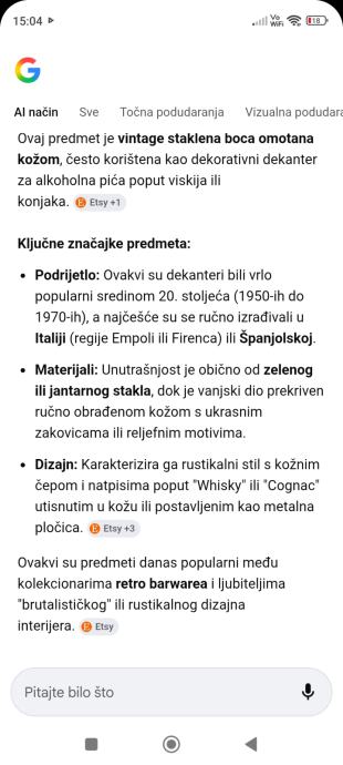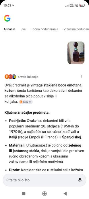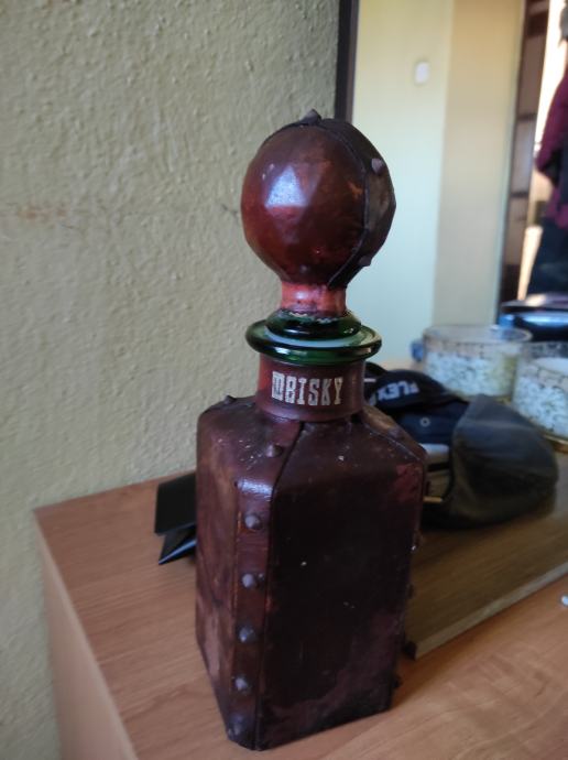 Starinska boca- dekander iz 1953 godine,rucno je rađena, boca ima natpis WHISKY koji se može skinuti,od 1 litre je.Za sve informacije nazovite na broj 097-6601365 ili pošaljite upit na Viber ili Njuskalo, a Šaljem Poštom ili Tiskom ili u dogovoru sa kupcem, stanje dobro,, pogotovo za te godine.Nekome idealan ukras za police kuce ,vikendicu,terasu, caffe bar, klet, etno imanje ili gdje vec kome pase, a moze se koristiti za pice po izboru.Vidi slike!!