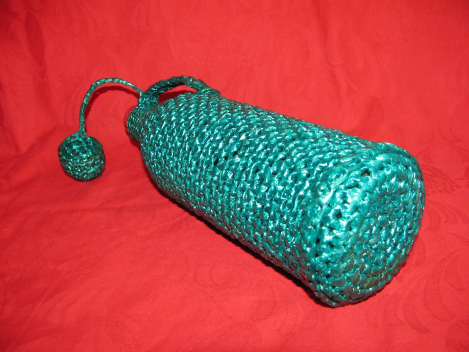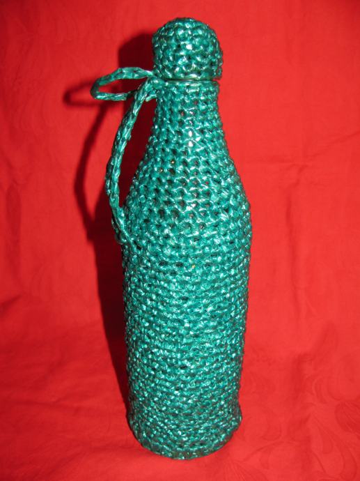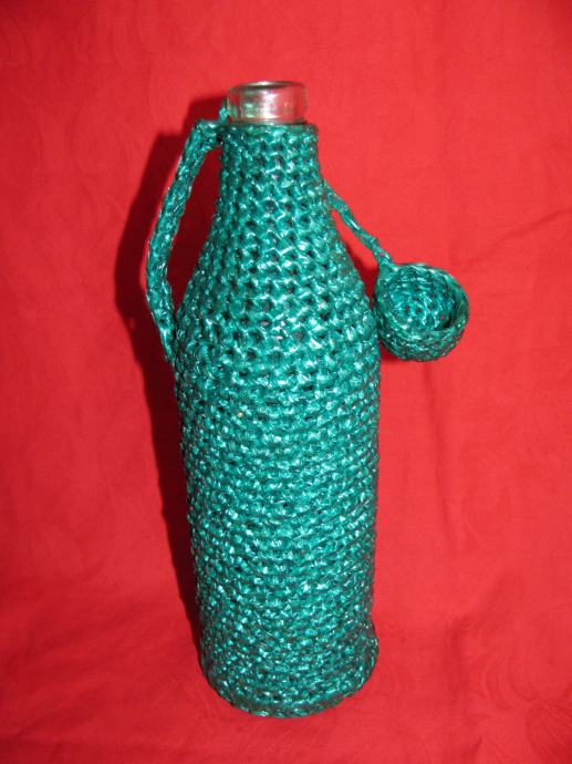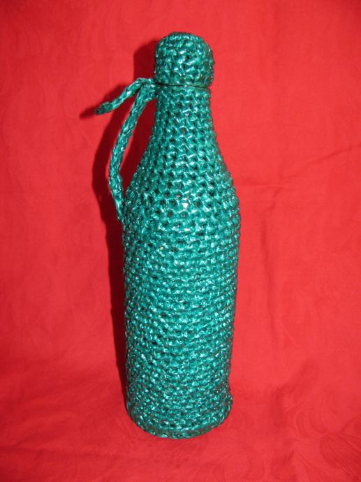 Stara boca opletena u zeleni plastificirani liko ili nešto slično.