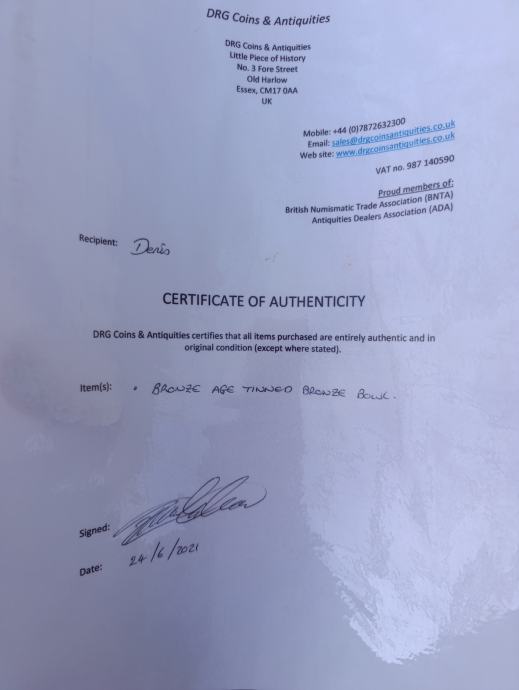 Prodajem originalnu kovanu brončanu zdjelicu iz brončanog doba. Izradile su je kasnobrončanodobne zajednice Britanskog otočja (proto‑keltske skupine), poznate po ručno kovanim utilitarnim posudama.