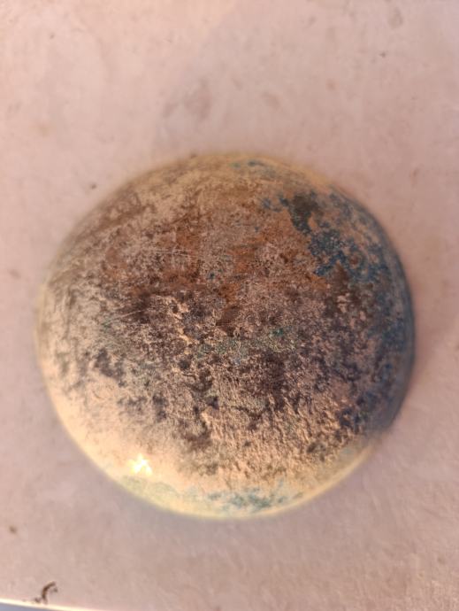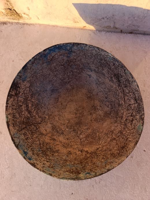 Zdjela ima prirodnu staru patinu, djelomično je očišćena, ali se jasno vide oksidacija, tragovi kovanja i naslage koje potvrđuju starost.