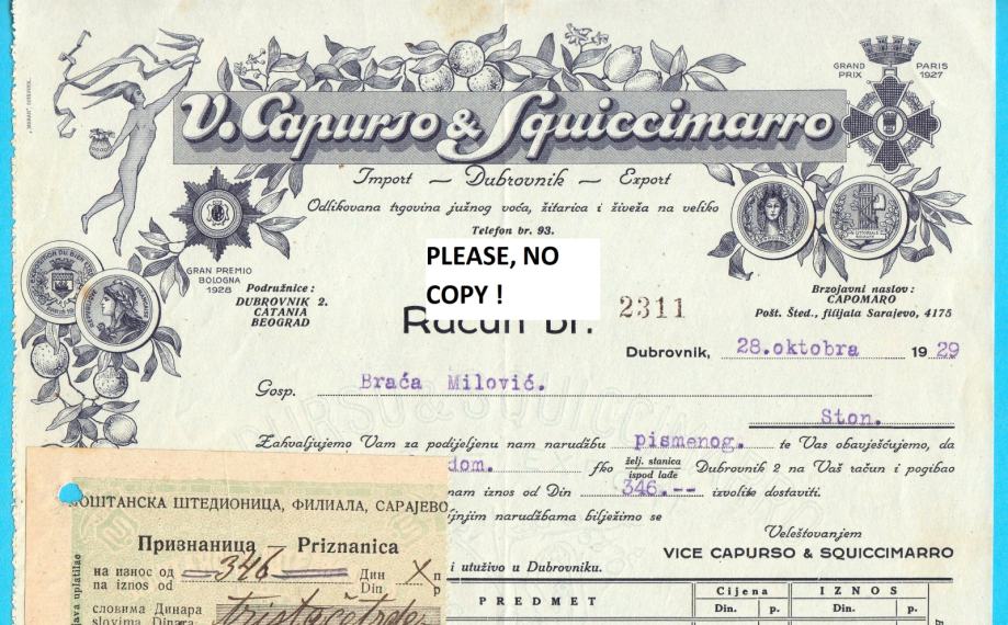 Prekrasni stari memorandum poznate dubrovačke trgovine voćem, vlasnika talijanskih doseljenika u Dubrovnik V. CAPURSO & SQUICCIMARO (Puljizi - doseljenici iz pokrajine Puglie).