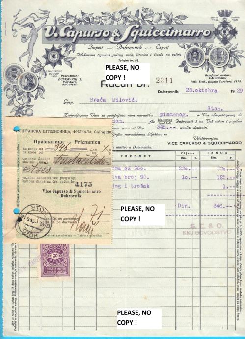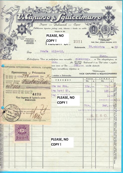 CAPURSO & SQUICCIMARO (DUBROVNIk) stari memorandum poslan 1929 u Ston