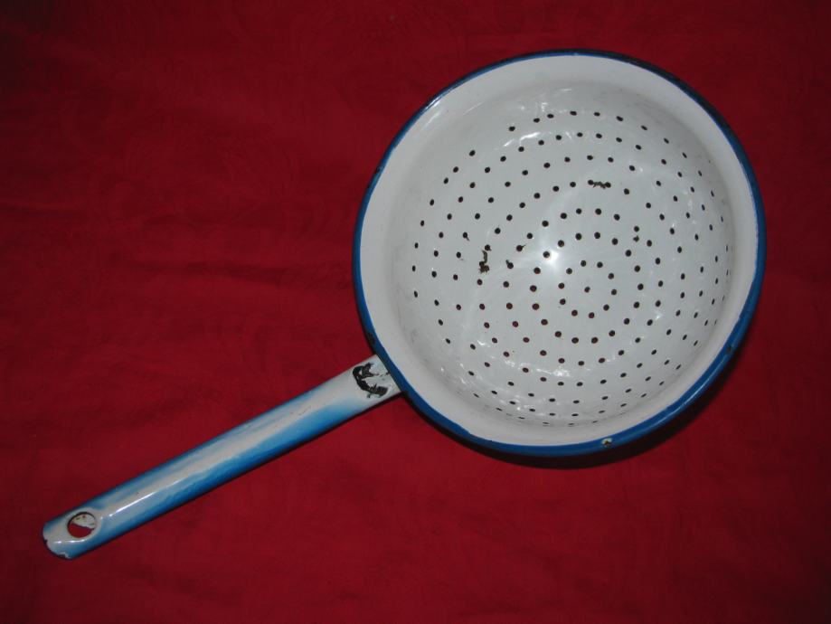 Stara emajlirana cjedilka sa vidljivim oštečenjem emajla.