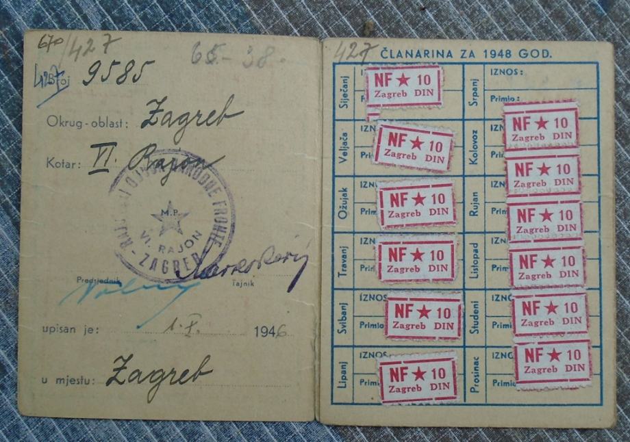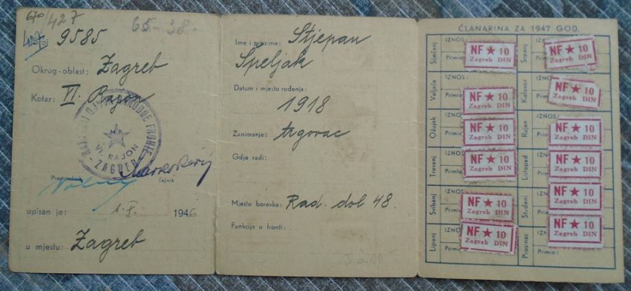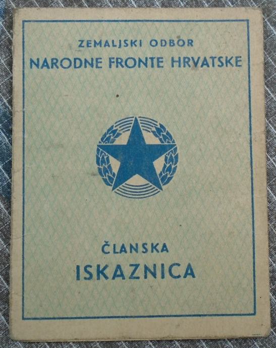 Članska iskaznica Zemaljskog odbora Narodne fronte Hrvatske iz 1946 g.