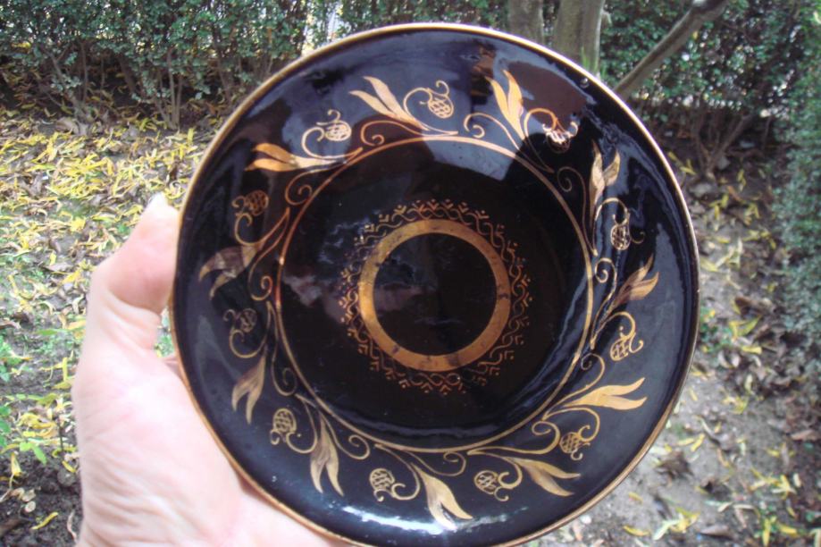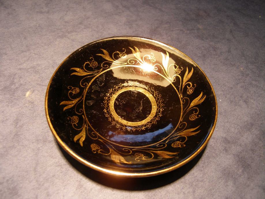 Vrlo stari crni tanjurić sa zlatnim oslikan, keramika, ručni rad, promjer 15cm