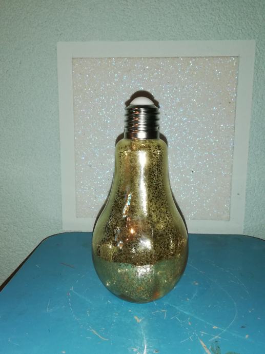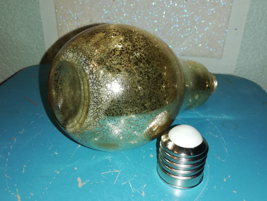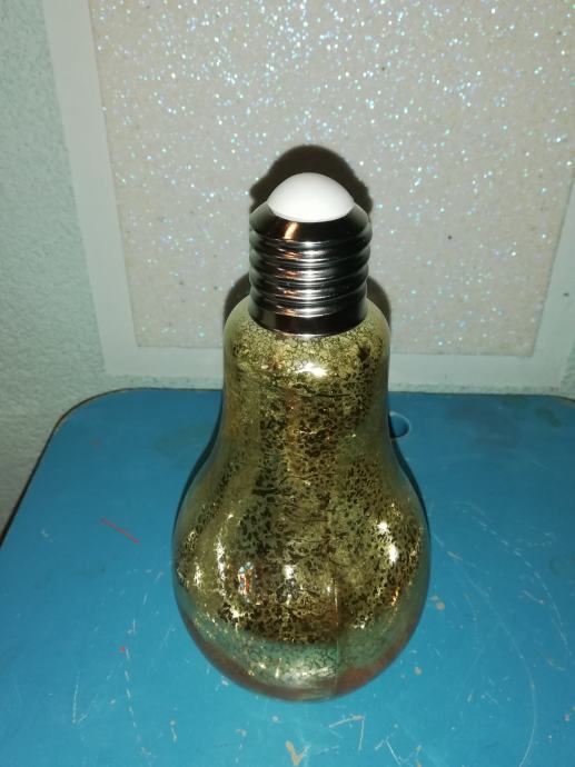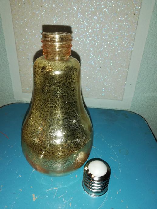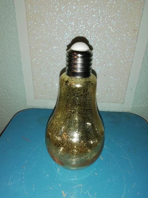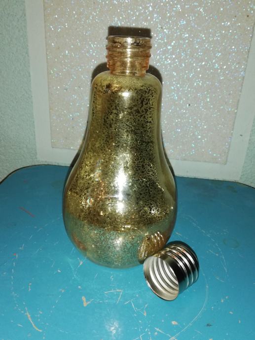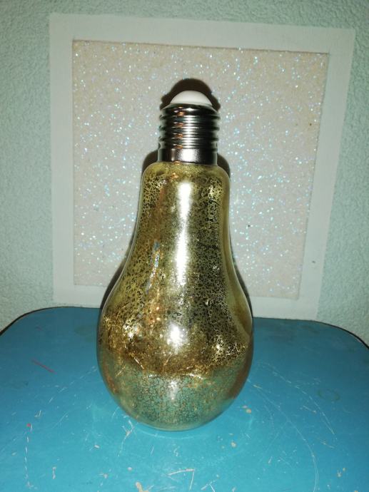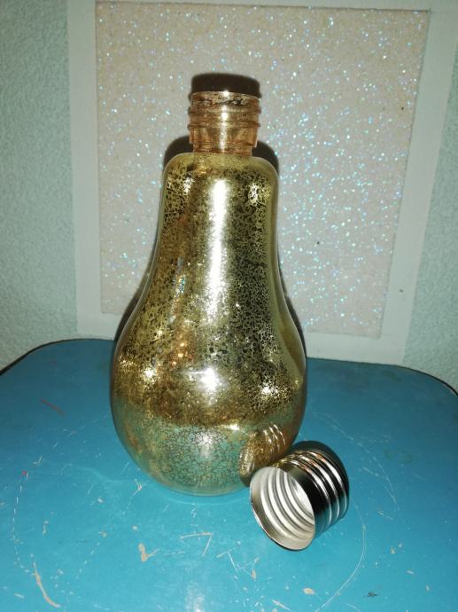 Staklena boca u obliku sijalice-žarulje u dekorativno svjetlucavoj zlatnoj nijansi sa efektom pukotine tzv. crack.