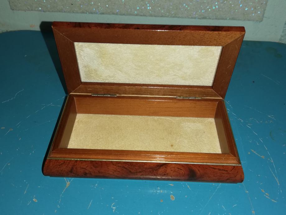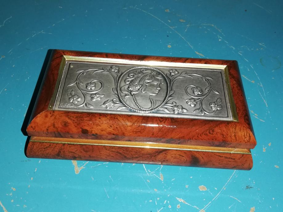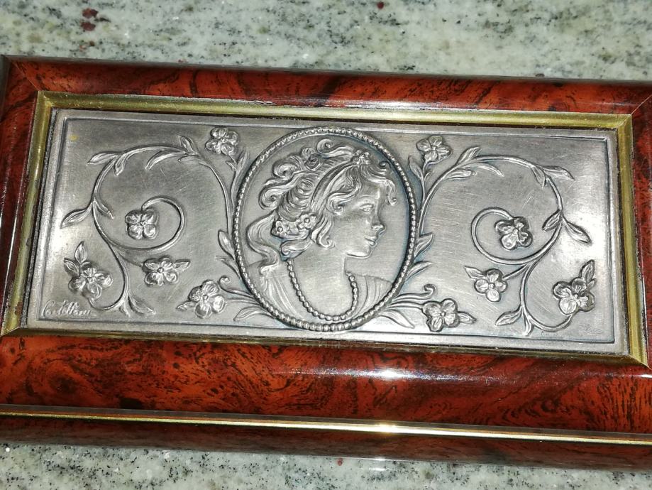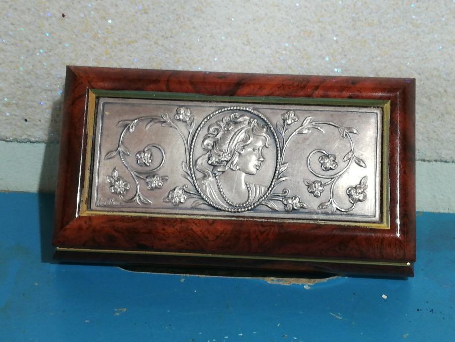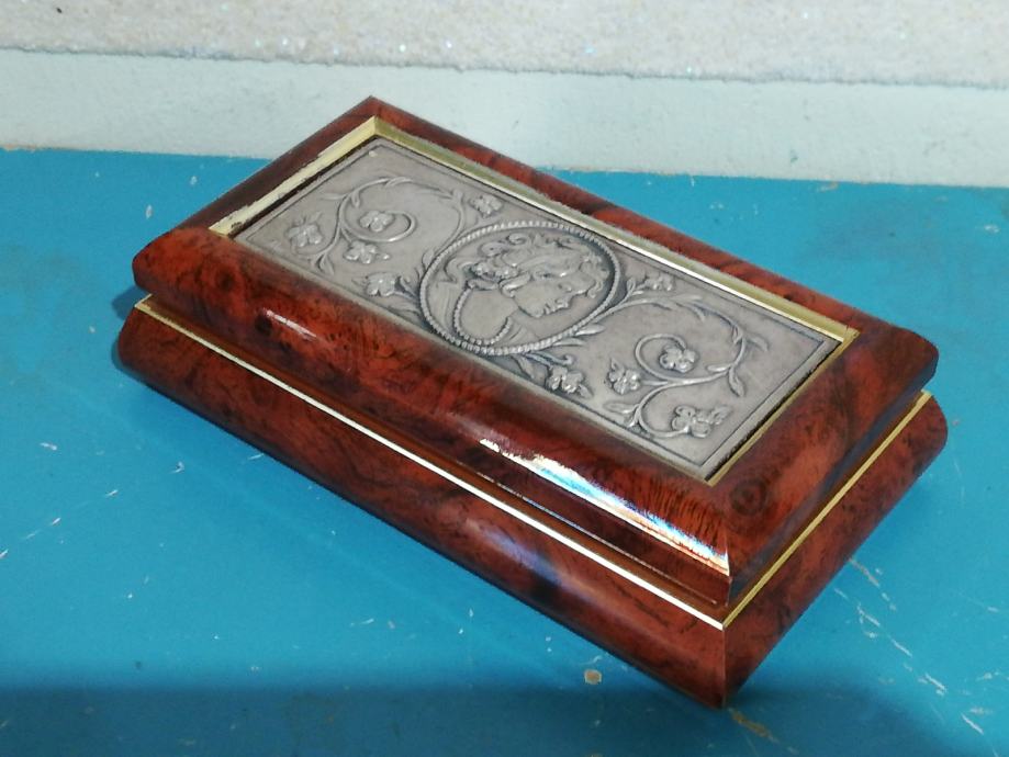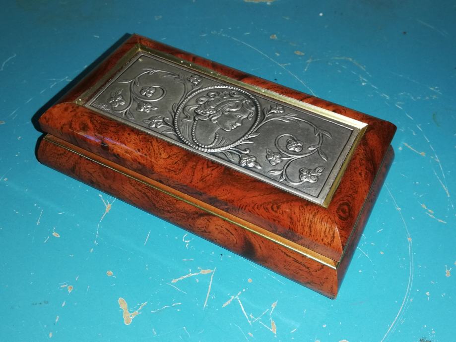 Dekorativna kutija za nakit. Materijal : drvo, posrebra, secesija, dimenzije 13,3 x 7,2 x 3,5 cm.