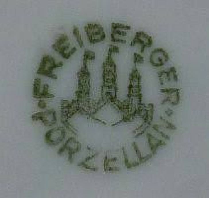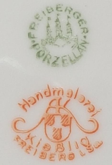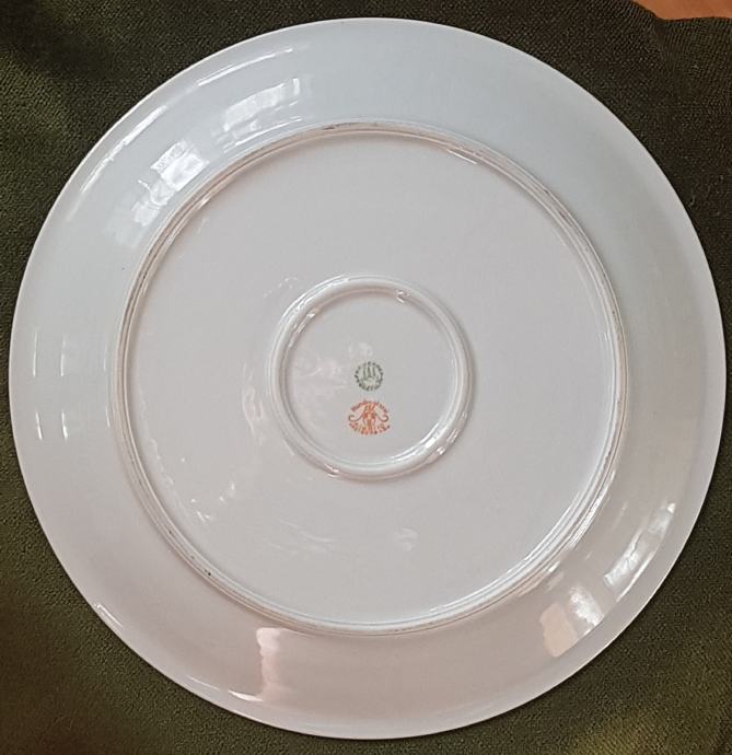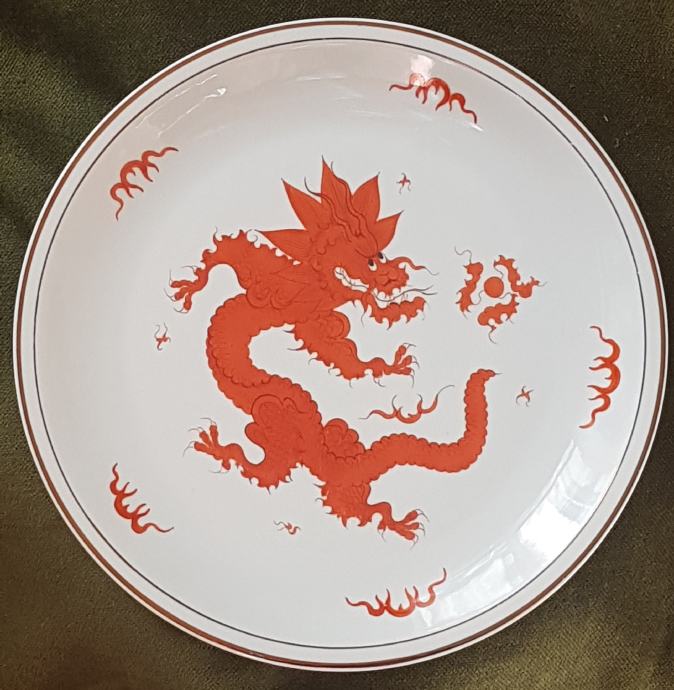 Odlično očuvan, ručno oslikan, dekorativni porculanski tanjur njemačkog proizvođača Freiberger Porzellan sa motivom zmaja (Ming - Drache). Promjer tanjura iznosi 28 cm, a masa 574 grama.