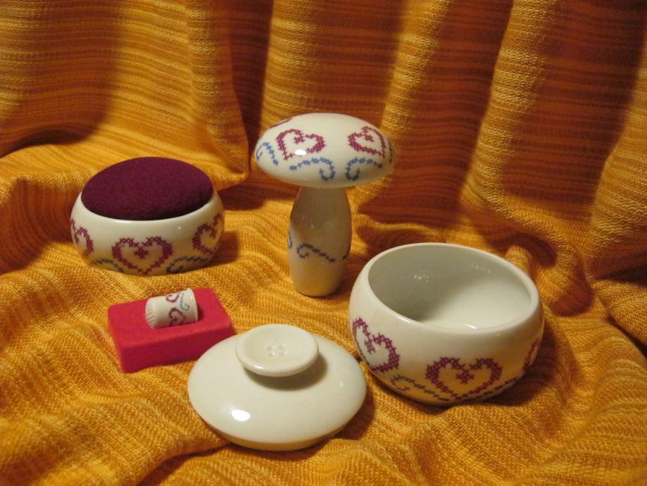 posudica s jastučićem za igle i pribadače , gljiva za "štopanje" i napršnjak .