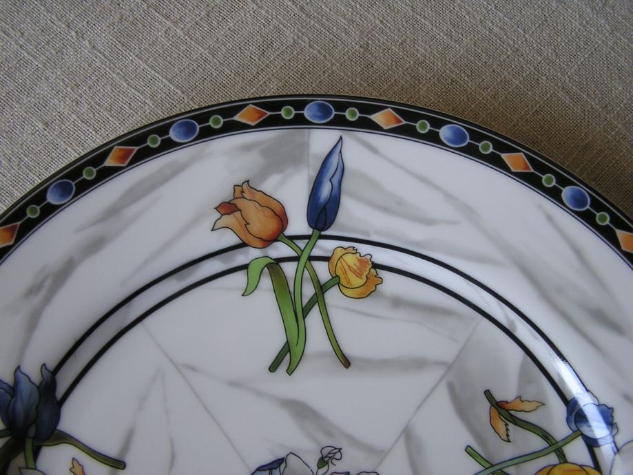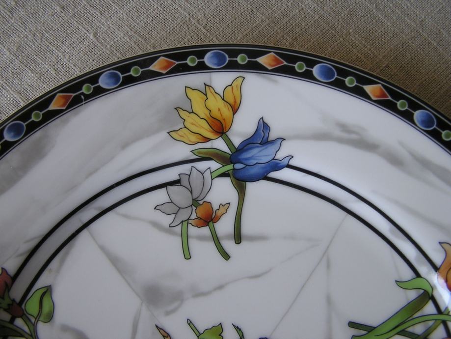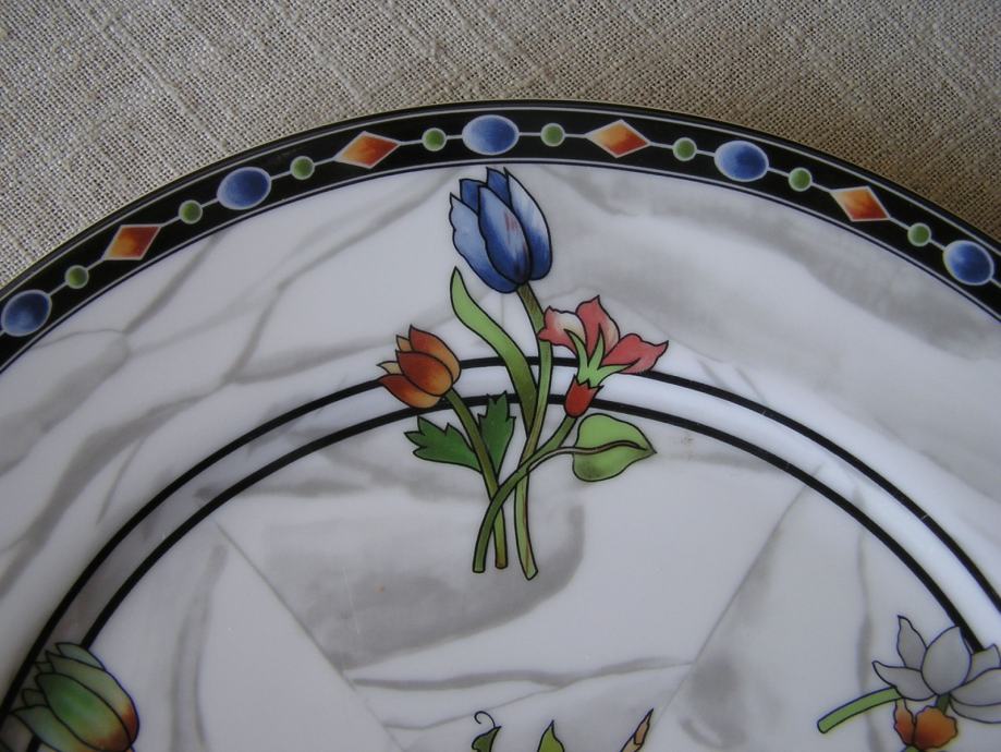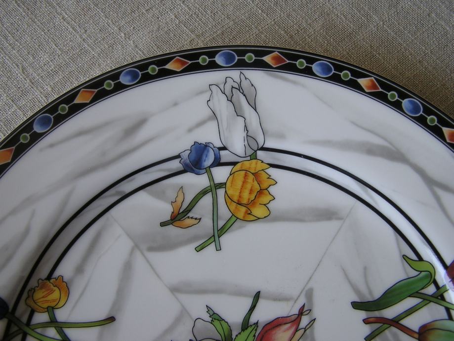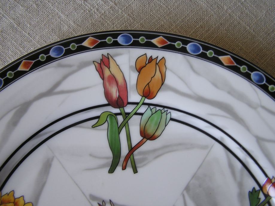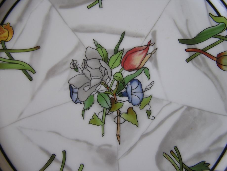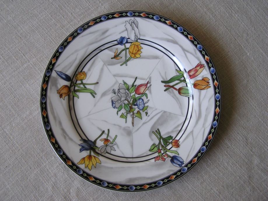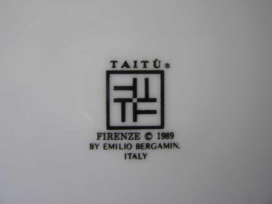 Porculanski plitki tanjur talijanskog dizajnera porculana Emilia Bergaminia iz 1989. Iz dizajnerske serije "Firenze". Na podlozi koja podsjeća na mramor su cvjetni buketići u živim bojama. Pladanj ima žig "Taitù" što je i naziv tvrtke ovog dizajnera, a dao joj je ime po etiopskoj carici koja je voljela ljepotu. E. Bergamin porculan je cijenjen i poznat, bio je na puno izložbi u Europi i Americi.