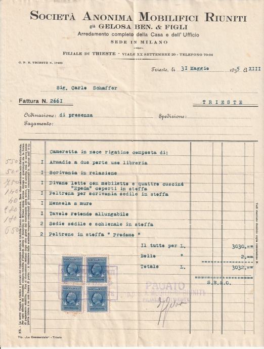 Dok,Societa Anonima Mobilifici Riuniti iz Milana fil.Trieste rč 1935 g