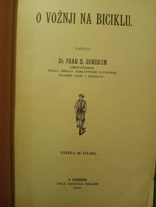 Prodajem knjižicu na. 39 stranica, O vožnji na biciklu, dr Frana S. Gundruma, stanje vrlo dobro, Zagreb 1904g. Plačanje na račun ili gotovina.