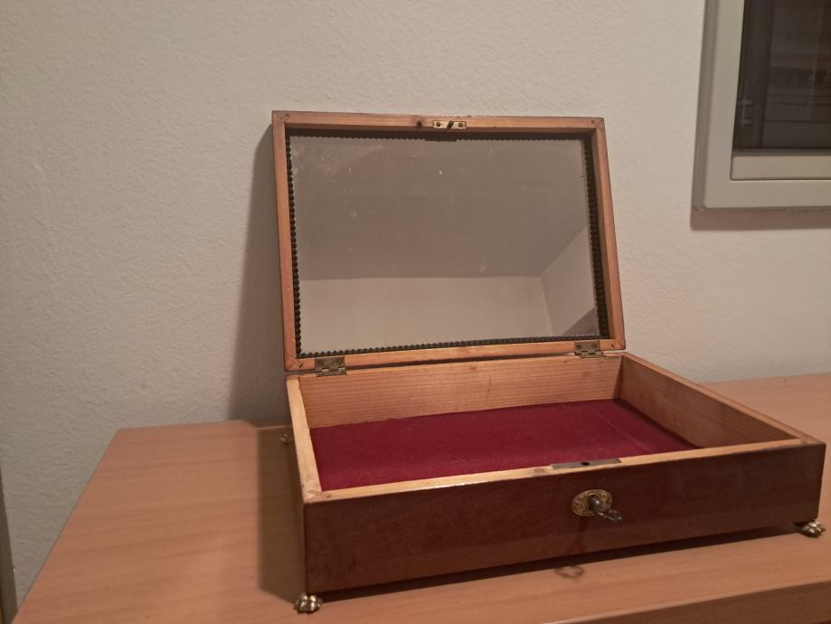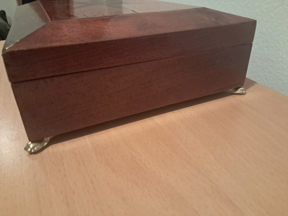 Ručno izrađena drvena kutija iz 1920./30., s iznimno dobro očuvanim geometrijskim intarzijom na poklopcu. Izrađena od više vrsta drva. S karakterističnim višeslojnim uzorkom koji odražava majstorsku obrtničku tradiciju.