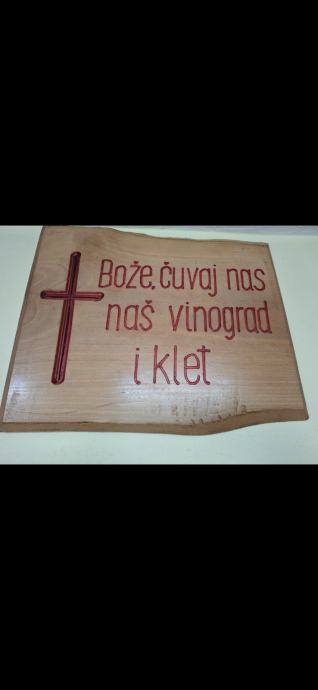 Izvrsna dekoracija za konobe, vikendice i vinske podrume. Ploča je izrađena iz prirodnog komada drveta s ugraviranim i obojenim tekstom te motivom križa.