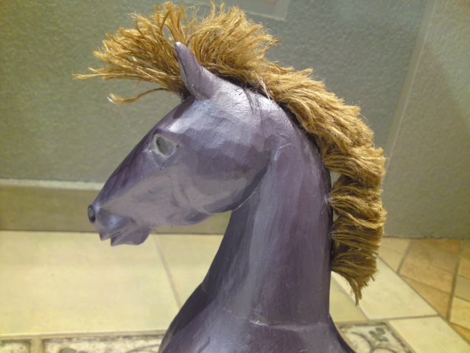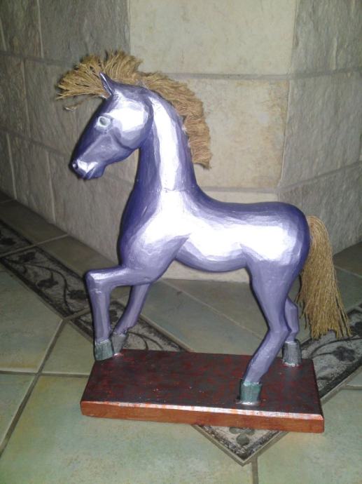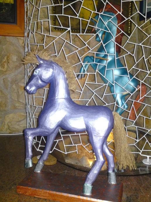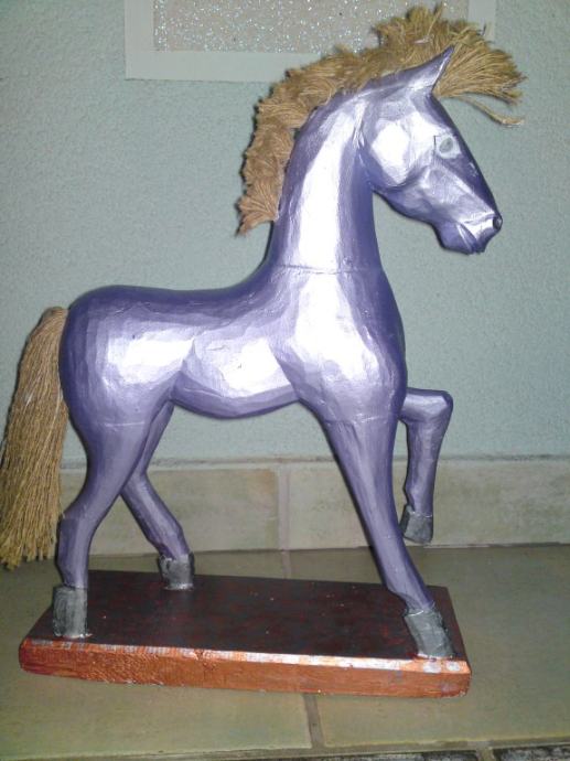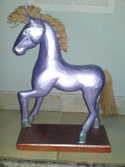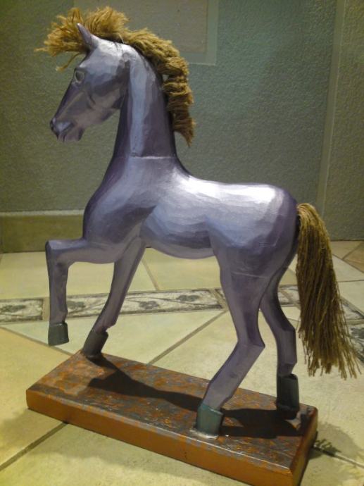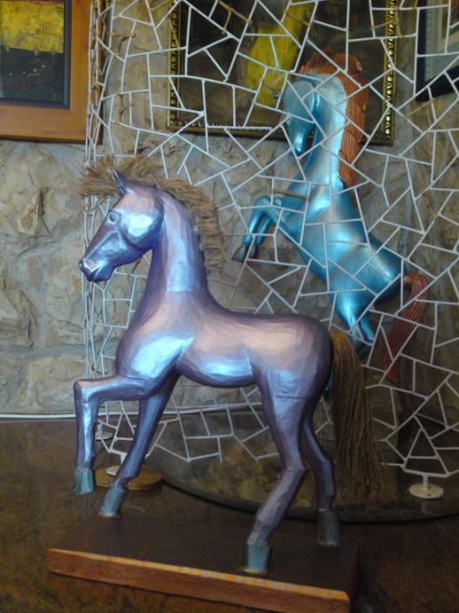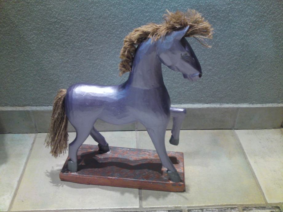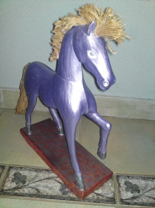 Stari drveni konjić, uređen premazom svilenkastog sjaja; boja : violet- metalik; prekrasna dekoracija za svaki interijer.