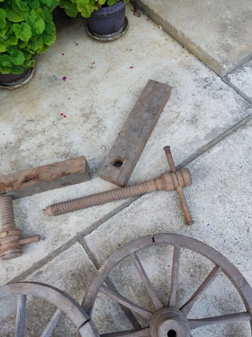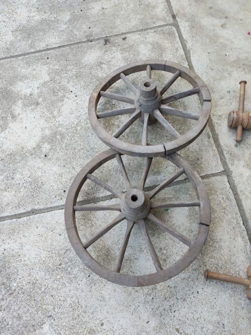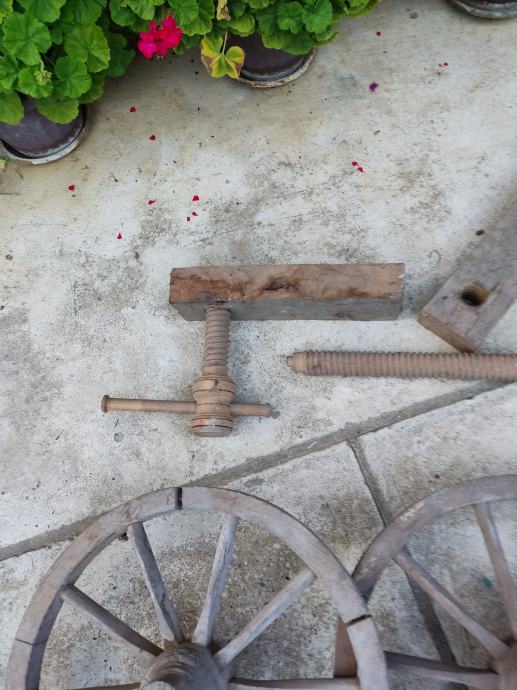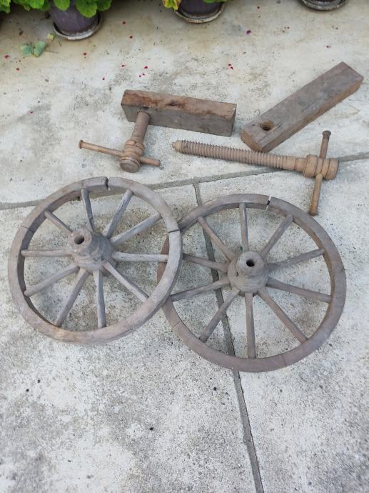 Prodajem 2 stara kotača za kola,stara oko 100 god, i 2 navojne špindle od drva,sa djelom,gdje taj navoj paše.Za sve tražim 150e