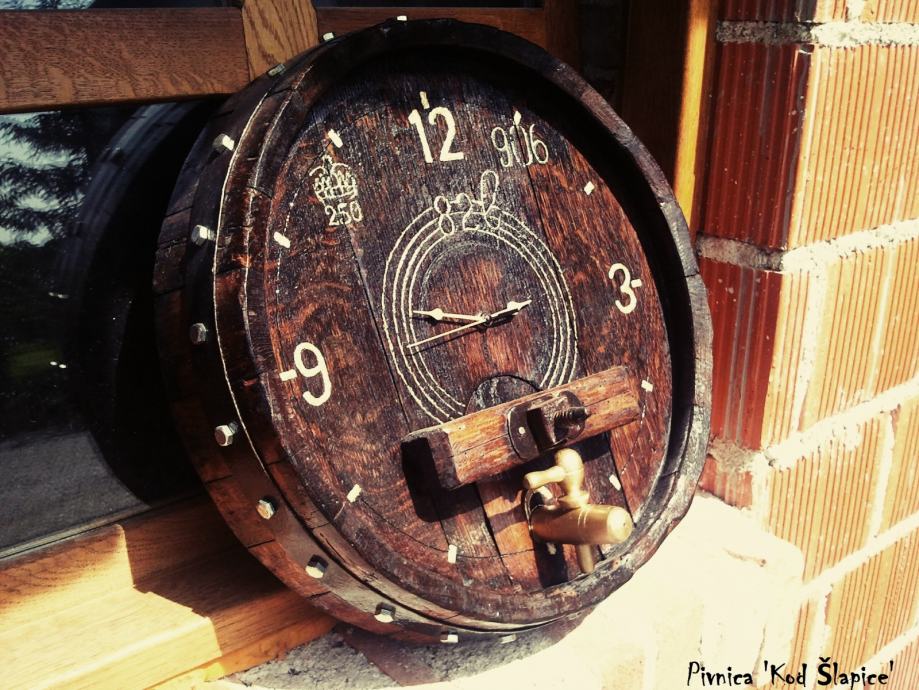 Drveni sat izračen od hrastove bačve, ukrašen zlatnom bojom, sa orginalnim žigom i godinom.