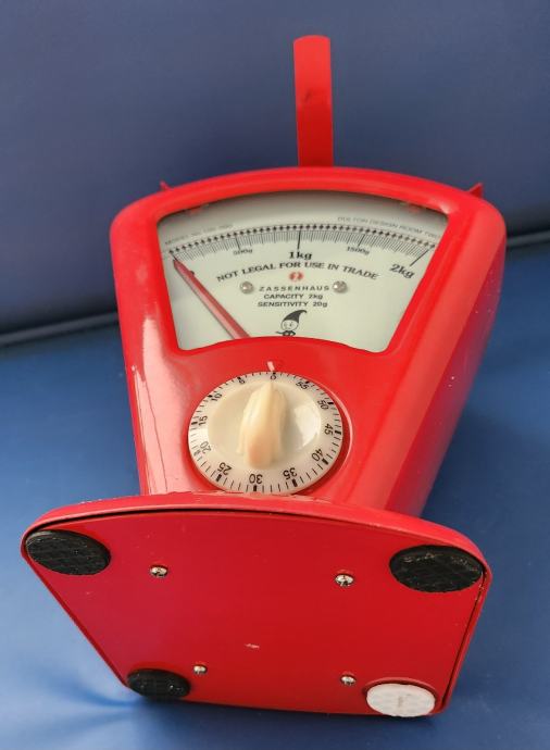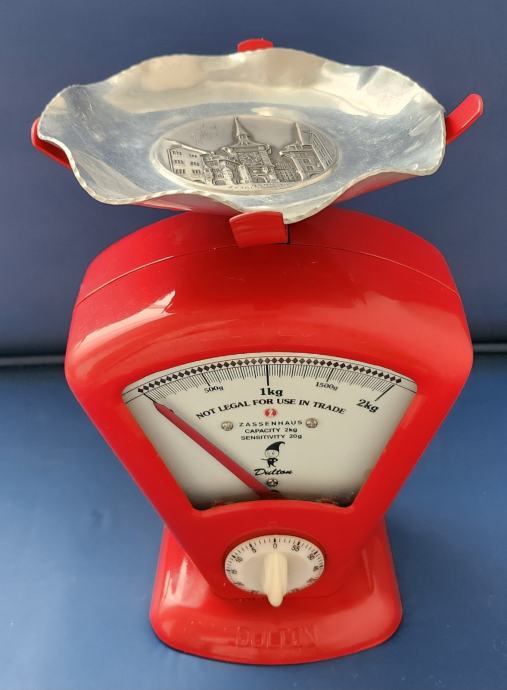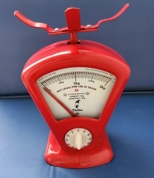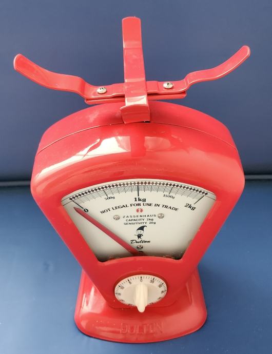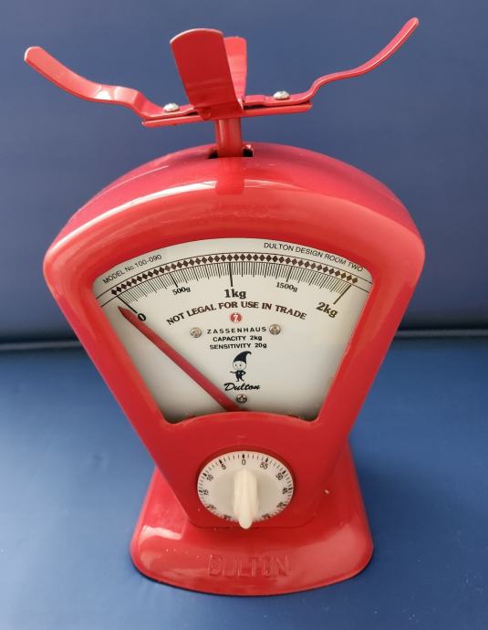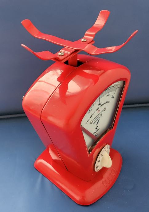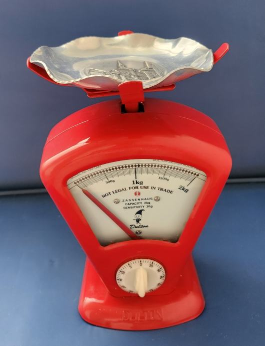 Predivna stara metalna kuhinjska vaga crvene boje iz sedamdesetih godina.