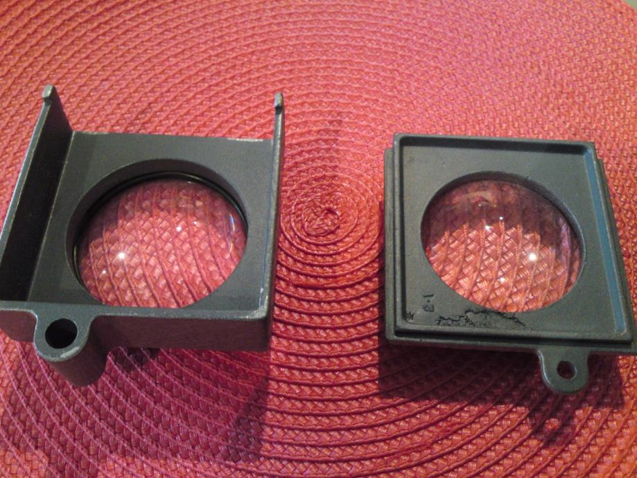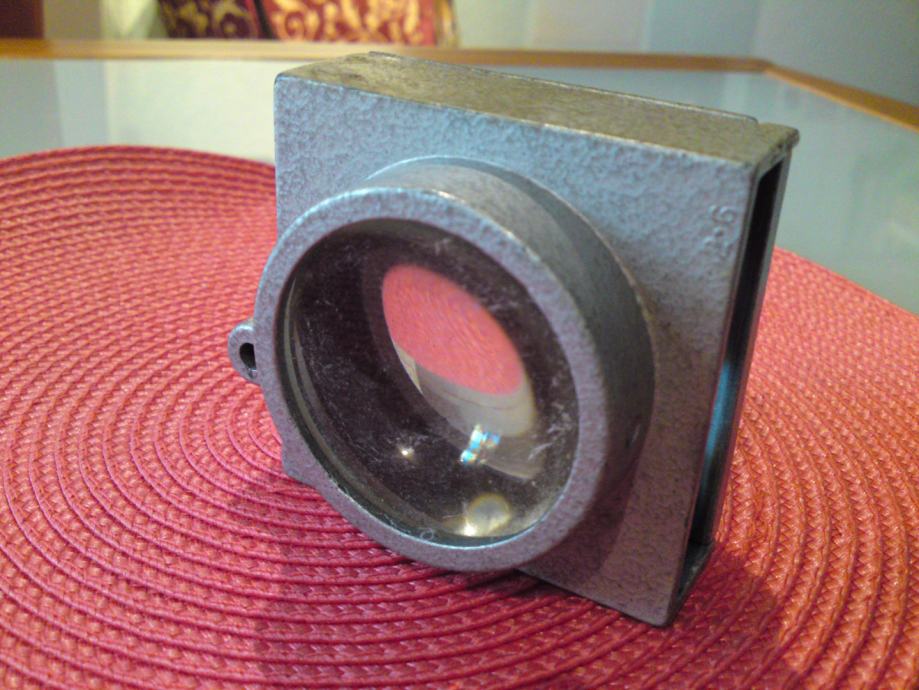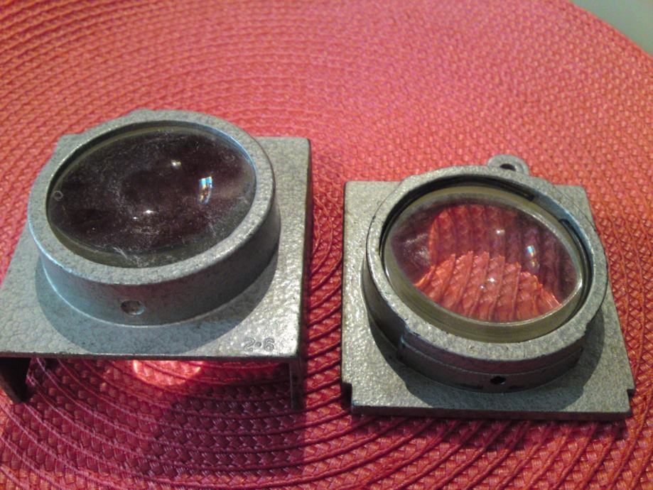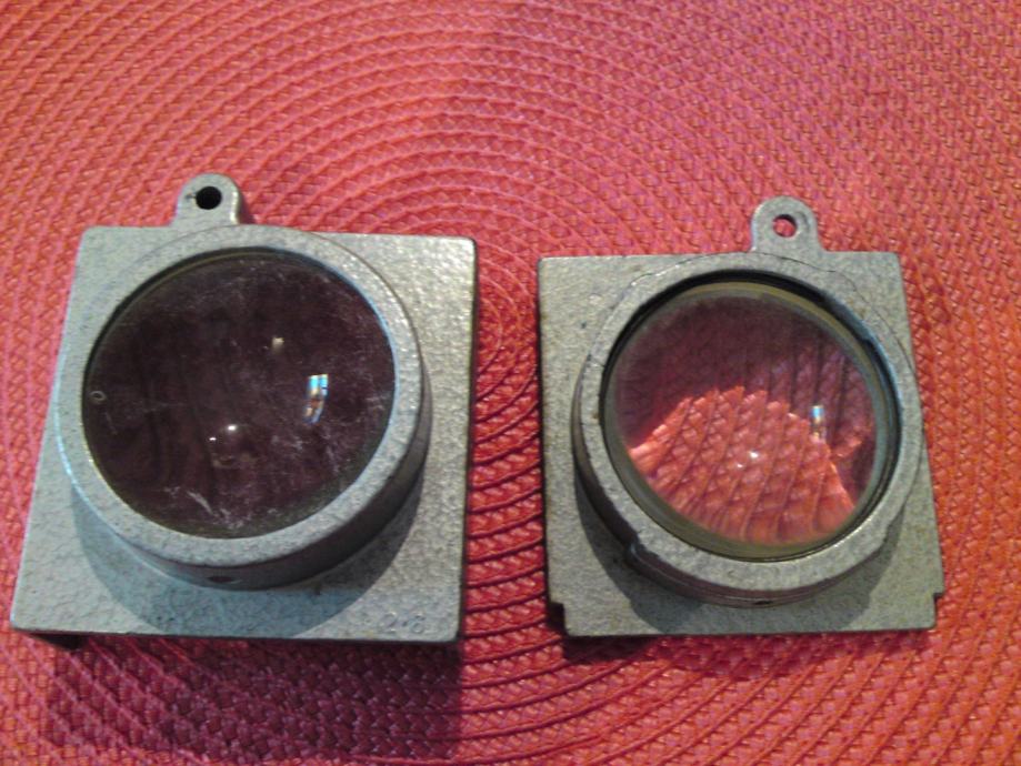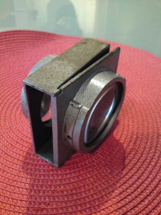 Dvostruka leća sa starog projektora, konkavna + konveksna; dimenziije: 7,5 x 7,5 x 5,5 cm; promjer leće: 5,5 cm (jedna) i 5,0 cm (druga).