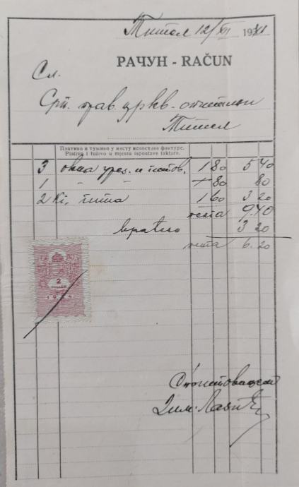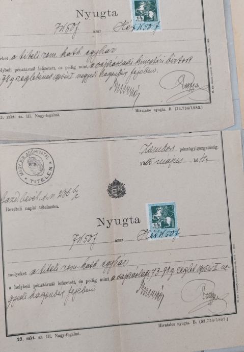 Crkvena povijest: Više potvrda o uplatama (Nyugta) za Rimokatoličku i Srpsku pravoslavnu crkvenu općinu u Titulu.