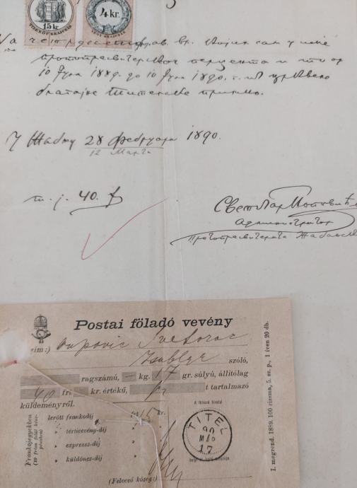 Najstariji primjerci (1890. – 1899.): Službeni dopisi krasopisom na ćirilici i rijetka poštanska potvrda s jasnim žigom.