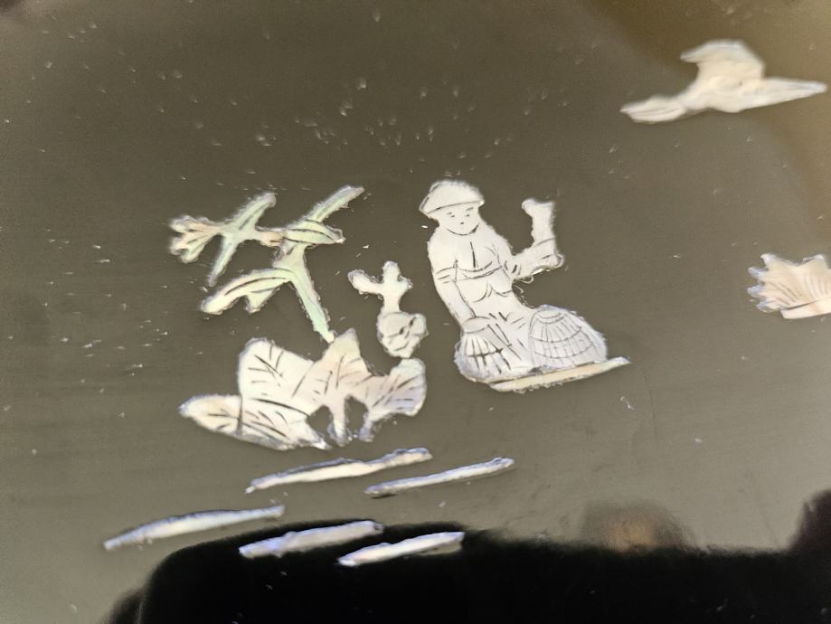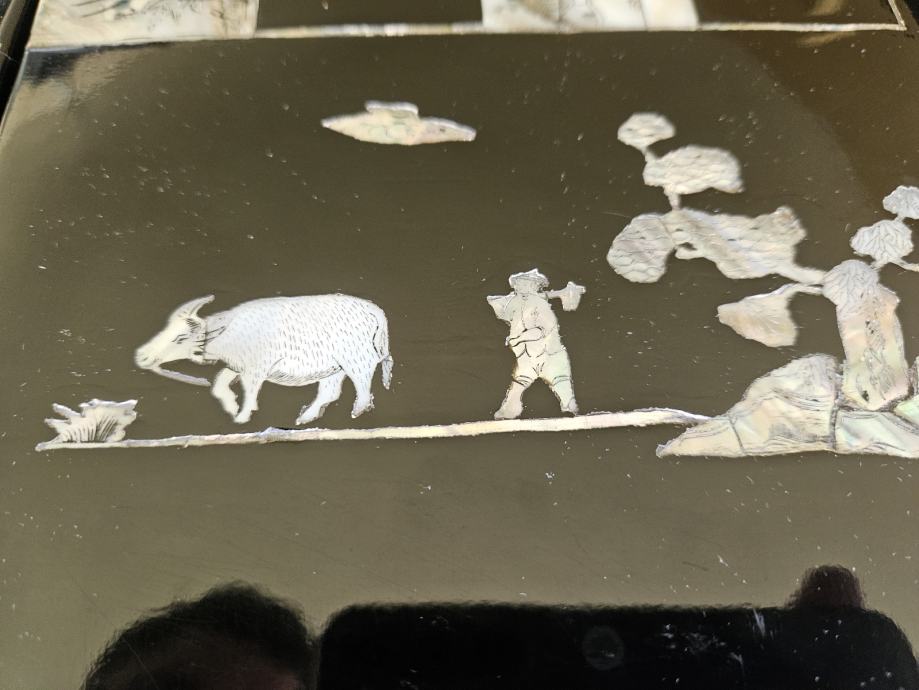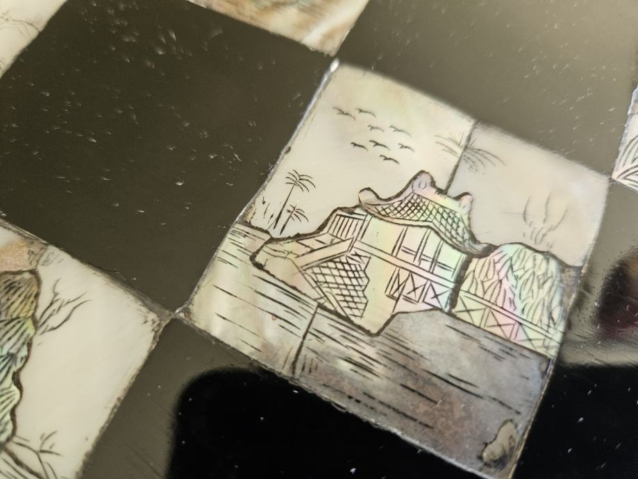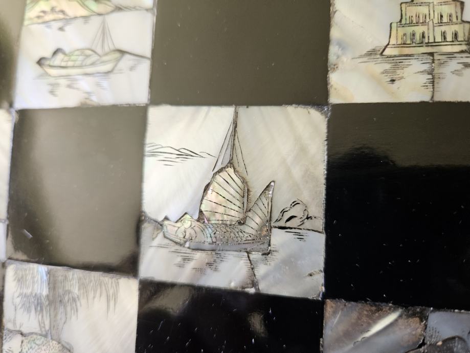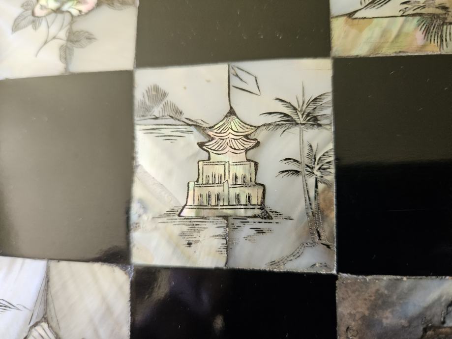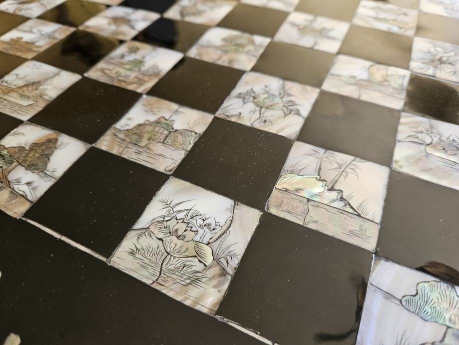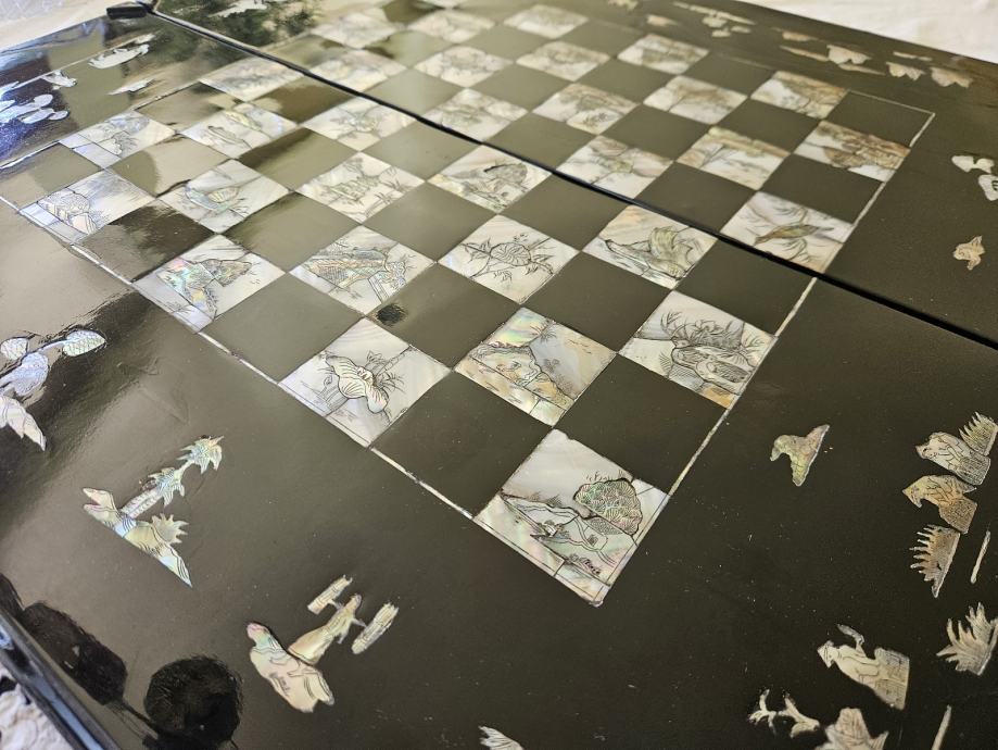 Šahovska ploča je prava mala umjetnina – crni lak s intarzijama od sedefa, ručno gravirani motivi cvijeća, pejzaža i životinja stvaraju poseban dojam luksuza i elegancije.