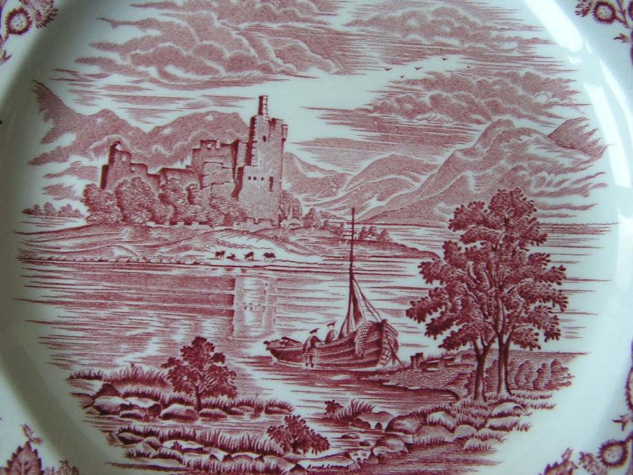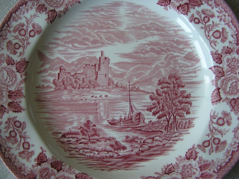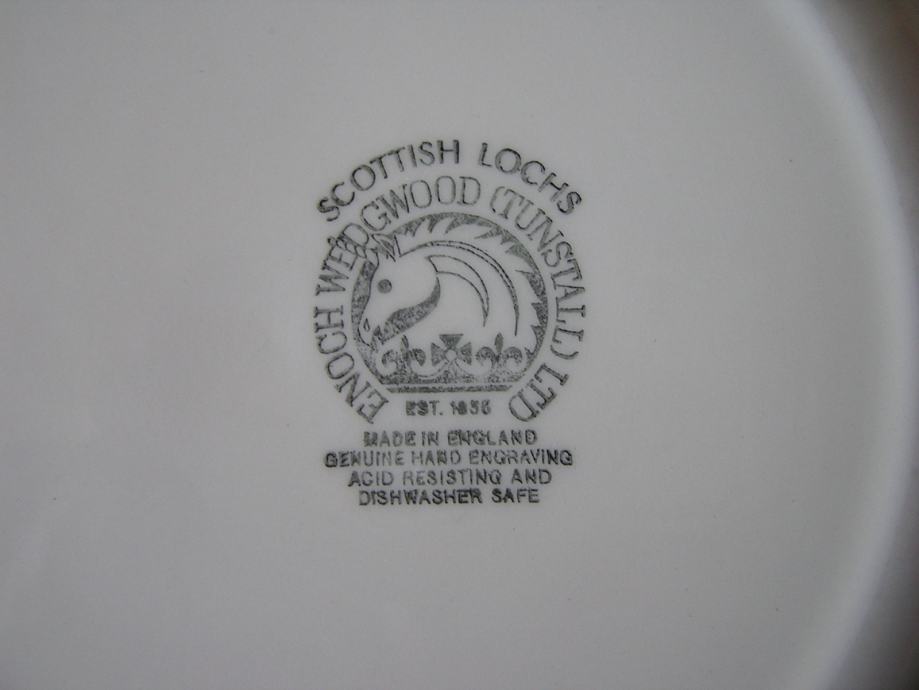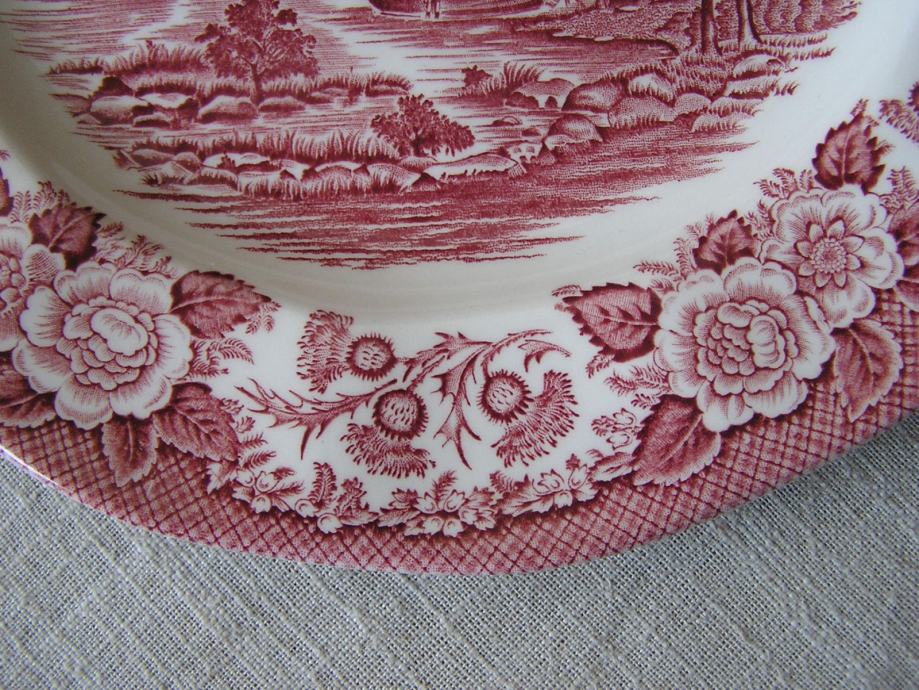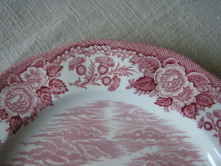 Dva veća plitka tanjura ili manja pladnja, engleski porculan, Enoch Wedgwood. Svi imaju isti dizajn u bordo crvenoj na podlozi boje slonovače koji je nazvan "Scottish Lochs". Dva tanjura su malo svjetlije nijanse bordo crvene i imaju žig koji se koristio u 1970im. Treći, malo tamniji ima žig koji se koristio u 1980im. Jedan svjetliji tanjur ima malo oštećenje s vanjske strane ispod ruba, s prednje nije vidljivo (zadnja slika). Sve ostalo kod svih tanjura je u odličnom stanju, bez oštećenja i ispucale cakline.