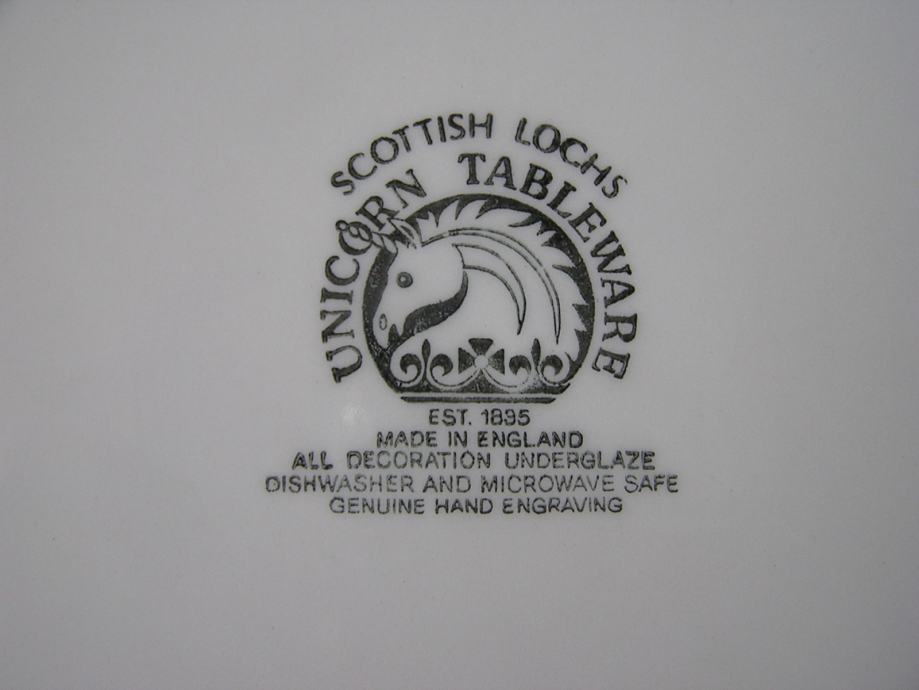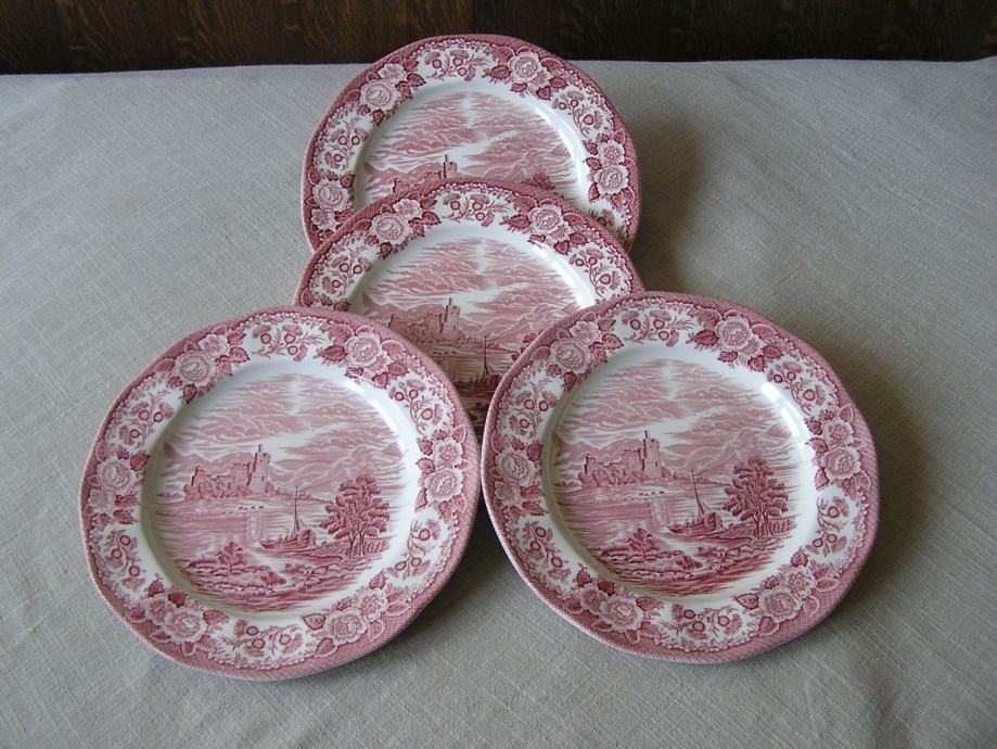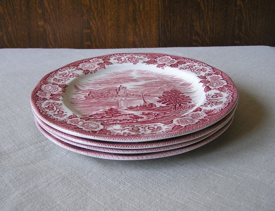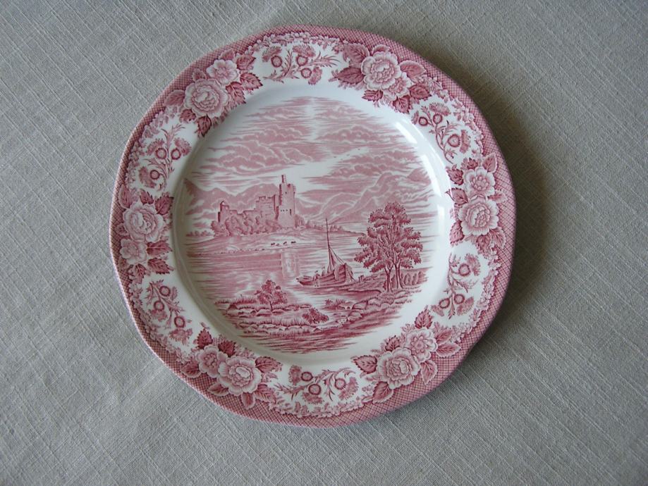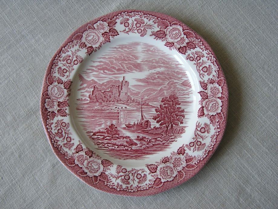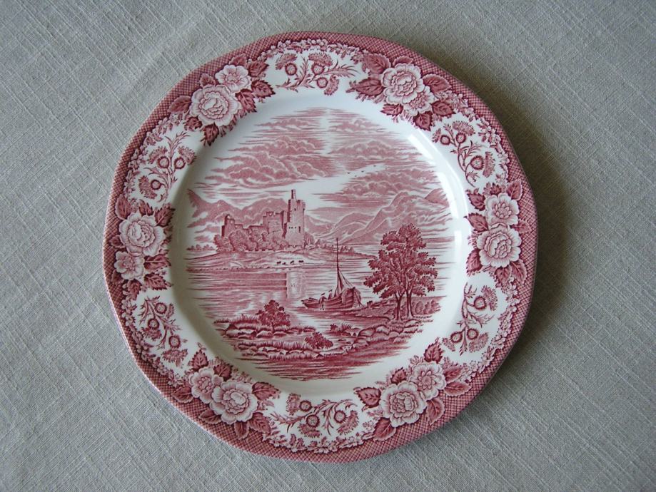 Dva veća plitka tanjura ili manja pladnja, engleski porculan, Enoch Wedgwood. Svi imaju isti dizajn u bordo crvenoj na podlozi boje slonovače koji je nazvan "Scottish Lochs". Dva tanjura su malo svjetlije nijanse bordo crvene i imaju žig koji se koristio u 1970im. Treći, malo tamniji ima žig koji se koristio u 1980im. Jedan svjetliji tanjur ima malo oštećenje s vanjske strane ispod ruba, s prednje nije vidljivo (zadnja slika). Sve ostalo kod svih tanjura je u odličnom stanju, bez oštećenja i ispucale cakline.