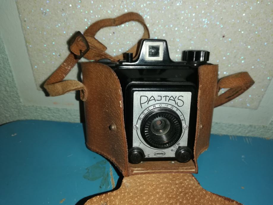 Stari bakelitni fotoaparat proizvođaća GAMMA, model: PAJTÁS iz 1955.g., Mađarska.Vrlo rijetki i vrijedni fotoaparat. Stil: kasni Art Deco. Kučište od bakelita sa linearnim i reljefnim detaljima. Kožni uzorci reljefni u bakelitu. Zakrivljeni dizajn kućišta .