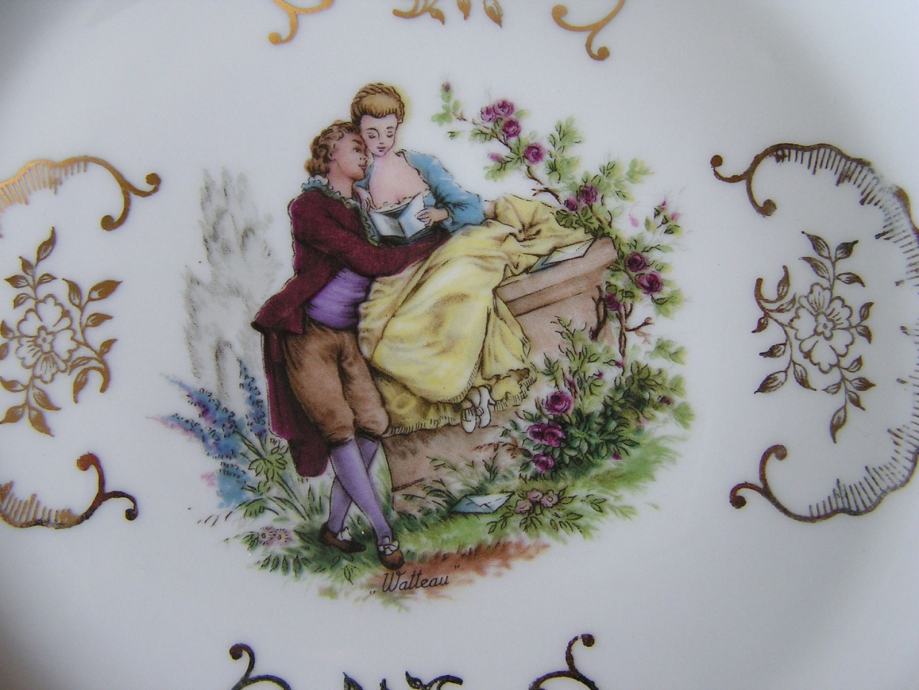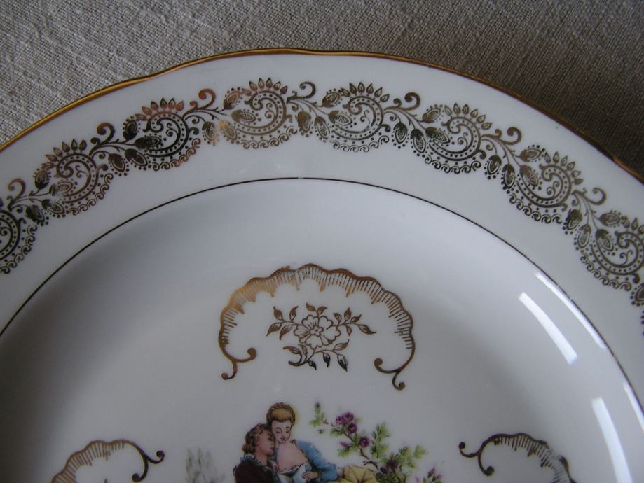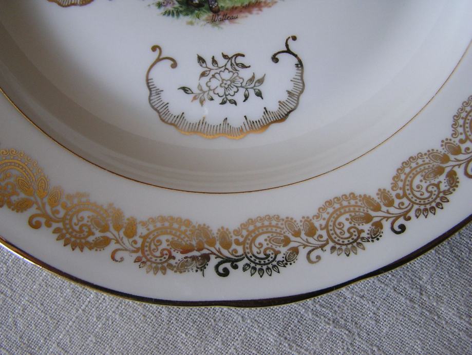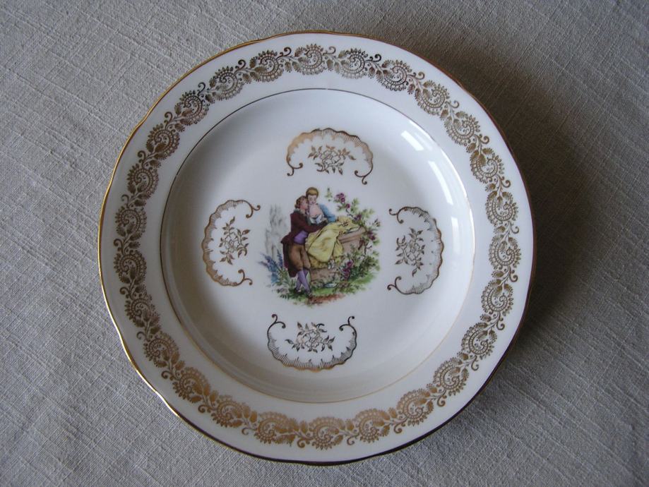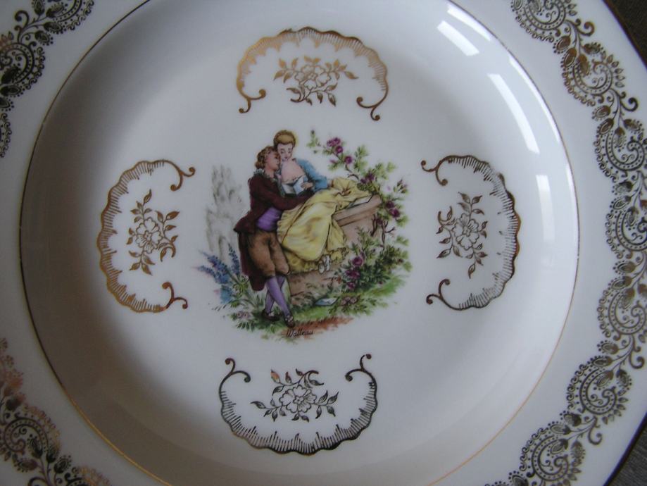 Porculanski tanjur, nešto između plitkog i dubokog. Francuski porculan, bijeli sa zlatnim ornamentuma, u sredini sa romantičnom sličicom francuskog slikara iz 18. st, Antoine Watteau. Nrma nikakvog oštećenja.