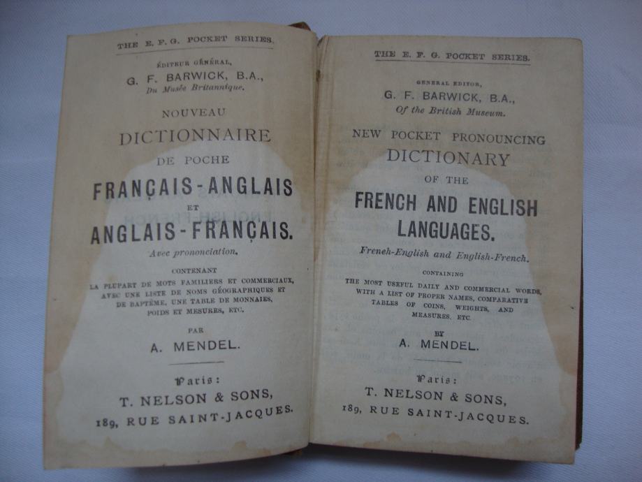 French-English,English-French dictionary by A.Mendel,Paris:T.Nelson&So