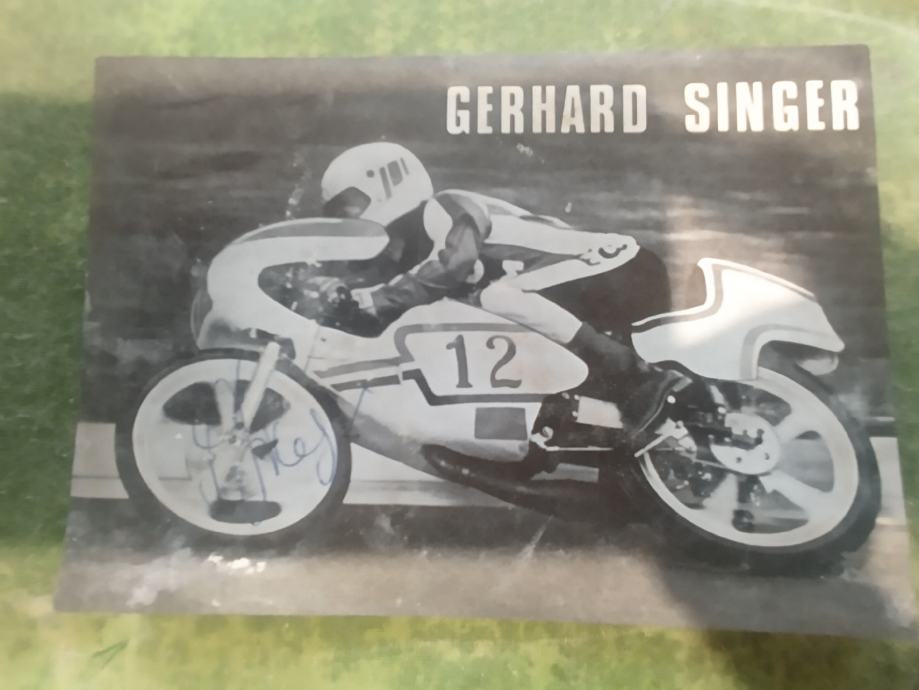 Prodajem reklamnu fotku veličine razglednice moto asa 70ih-80ih Gerharda Singera sa originalnim autogramom. Plačanje na račun ili gotovina.