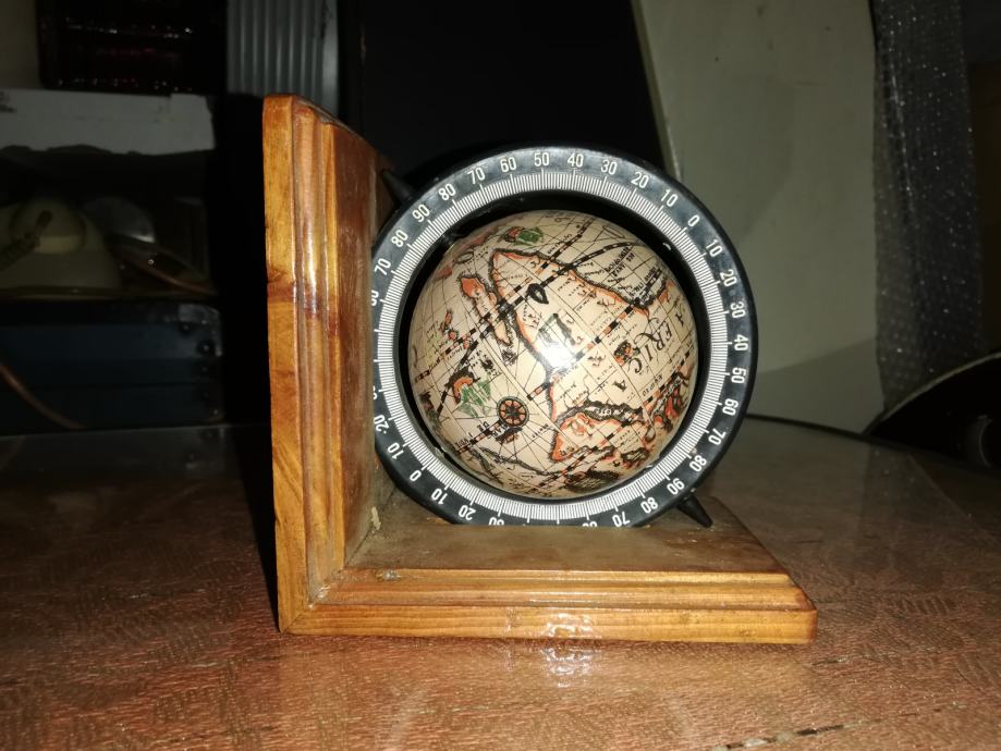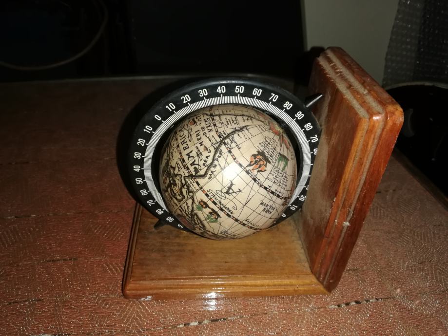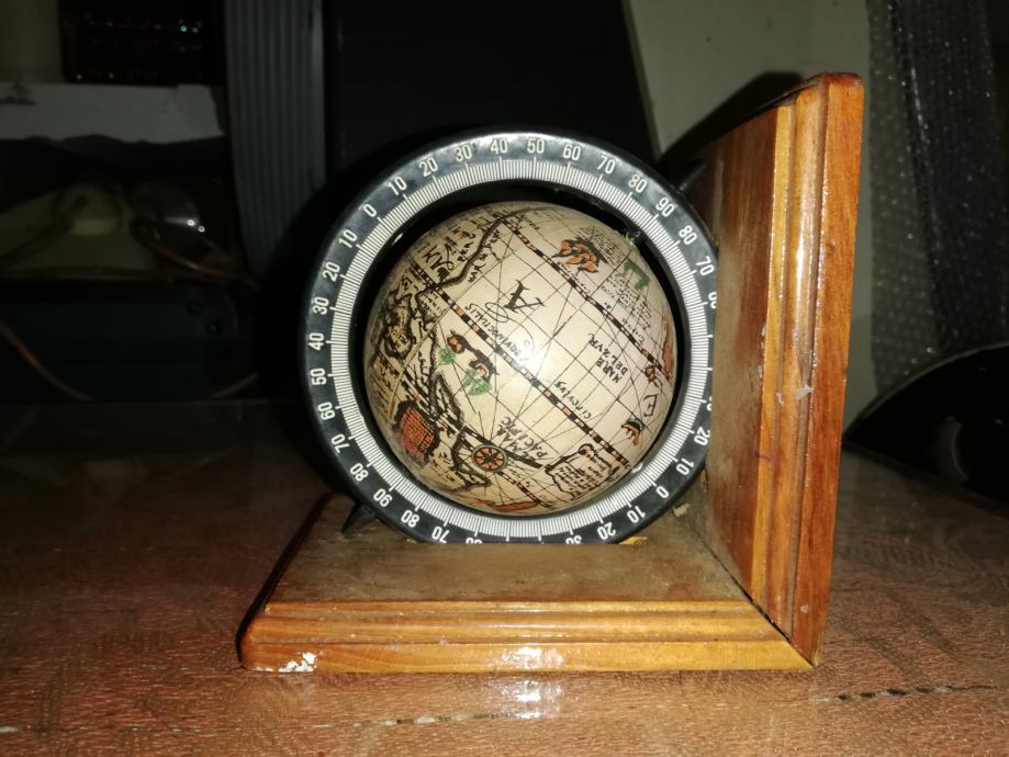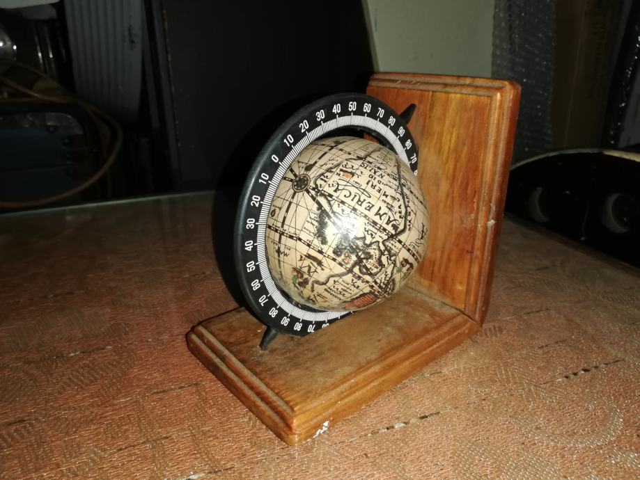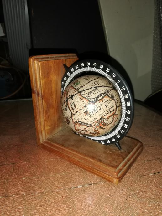 Podupirač za knjige u obliku globusa s kartom svijeta, koji služi za držanje vaših knjiga i dokumenata u uspravnom položaju. Uz to dobra dekoracija iz 1970-tih godina.