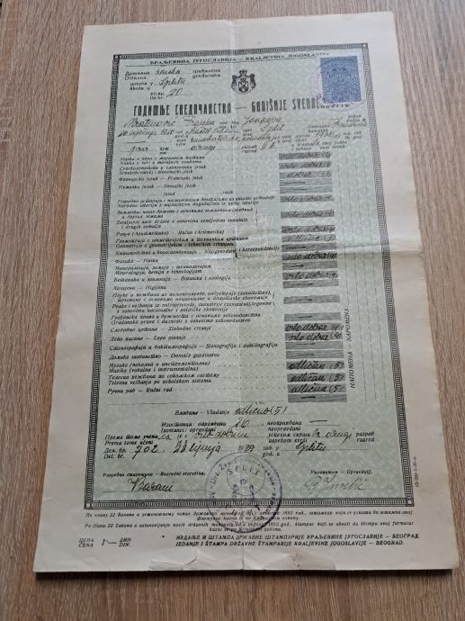 Godišnja svjedodžba Kraljevine Jugoslavije iz 1939 izdana u Splitu
