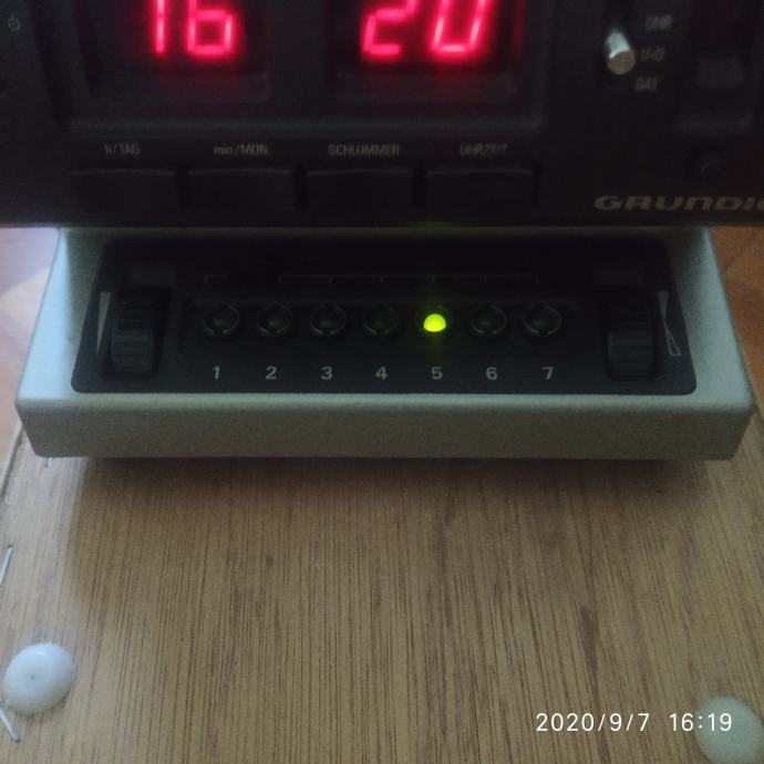 Wecker-Radio mit Digital-Anzeige, 7 Vorwahl-Sensortasten. Empfänger: 5 ICs, 7 Dioden.