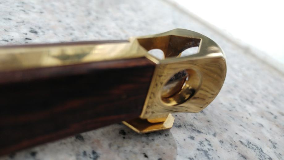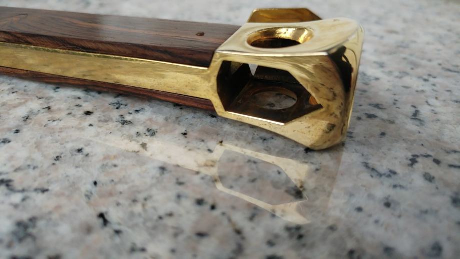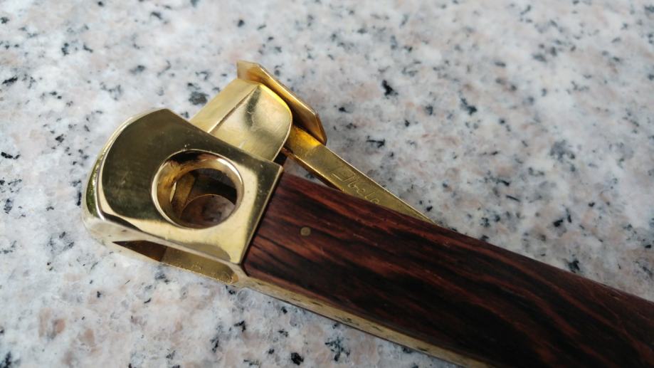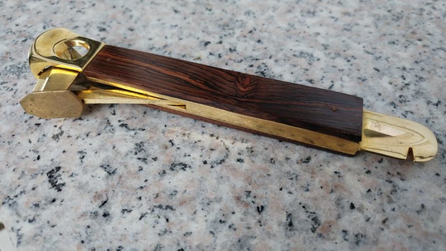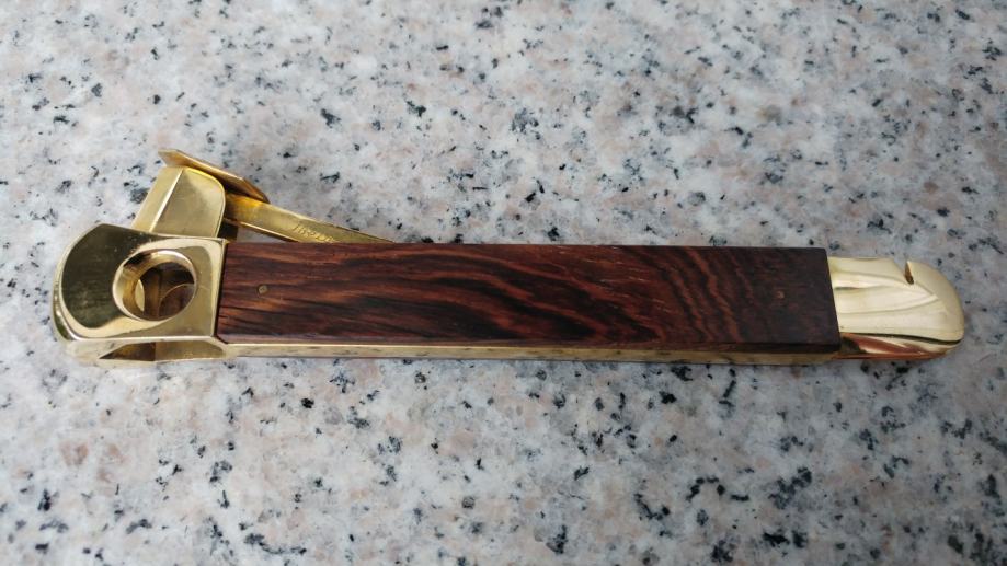 Prodajem prekrasni antikni rezač kubanki marke Ibelo negdje iz 70-ih godina porijeklom iz Njemačke. Rezač je pozlačen uključujući i nož, ima drvenu dršku. Dužina rezača je 15 cm i stane u đep ili torbicu.