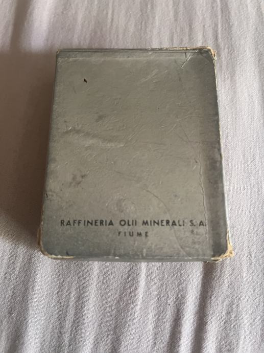 Predivne igrace karte izrađene 1940. U najpoznatijoj tvornici karata Modiano iz Trsta. Izrađene su i ukrašene motivom riječke rafinerije nafte. Romsa Fiume. Posebno se ističe futuristički dizajn ratnog aviona i auto koje zajedno spaja energija (nafta) iz rafinerije. Rat je u punom tijeku. Ove karte su iznimno rijetke jer su ih vjerojatno dobili samo ugledni gosti i djelatnici rafinerije.