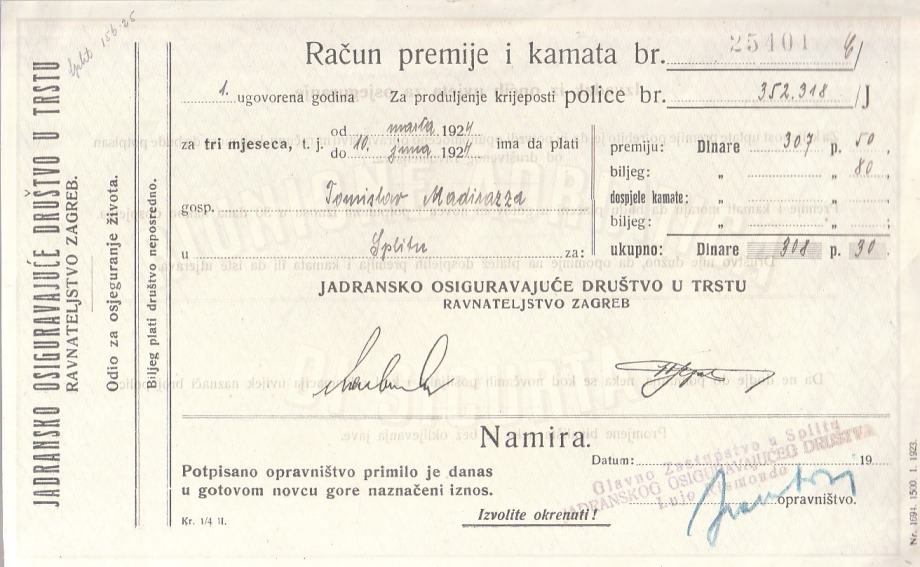 Jadrnsko osiguravajiće društvo u Trstu ra. Zagreb račun iz 1924 g