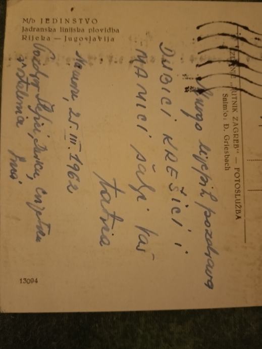 Prodajem staru razglednicu Jadrolinijinog broda Jedinstvo, putovala 1962g, stanje vrlo dobro. Plačanje na račun ili gotovina.