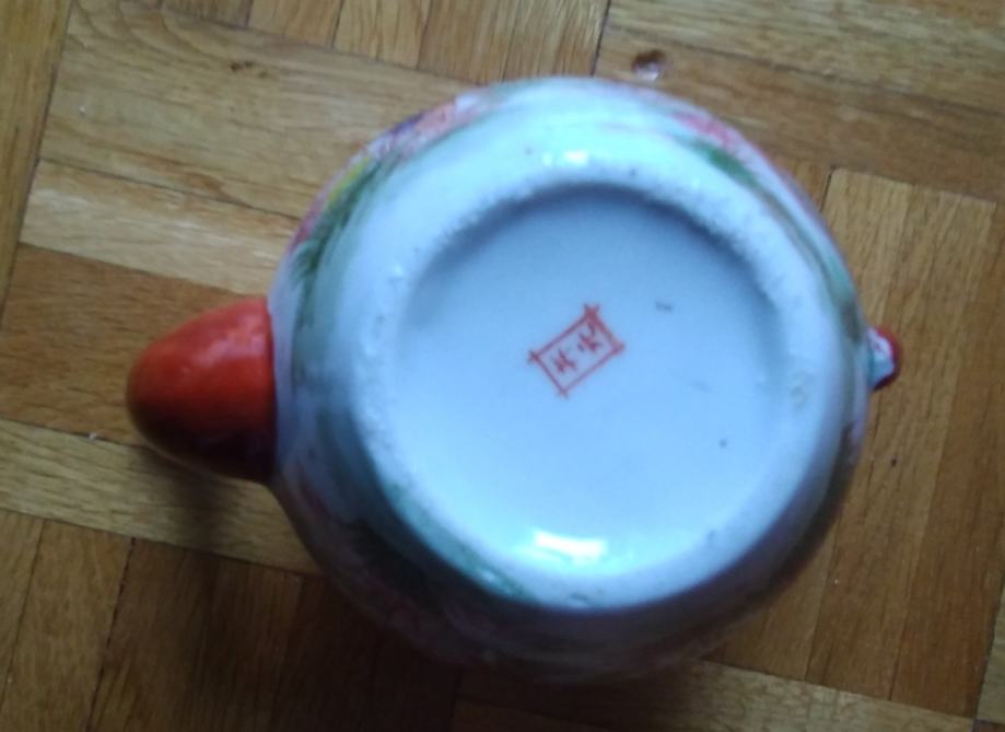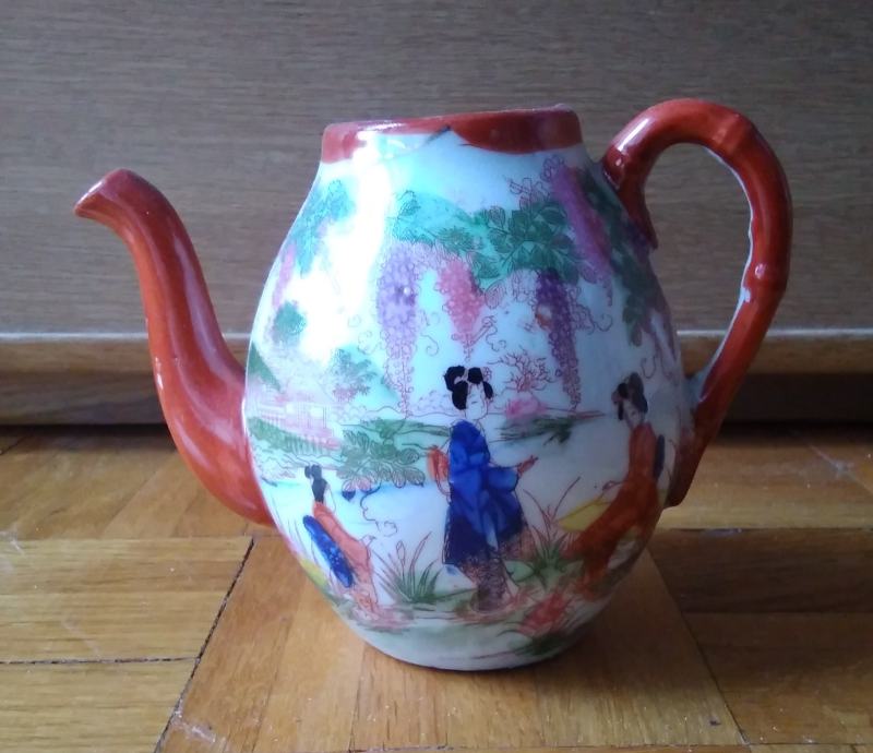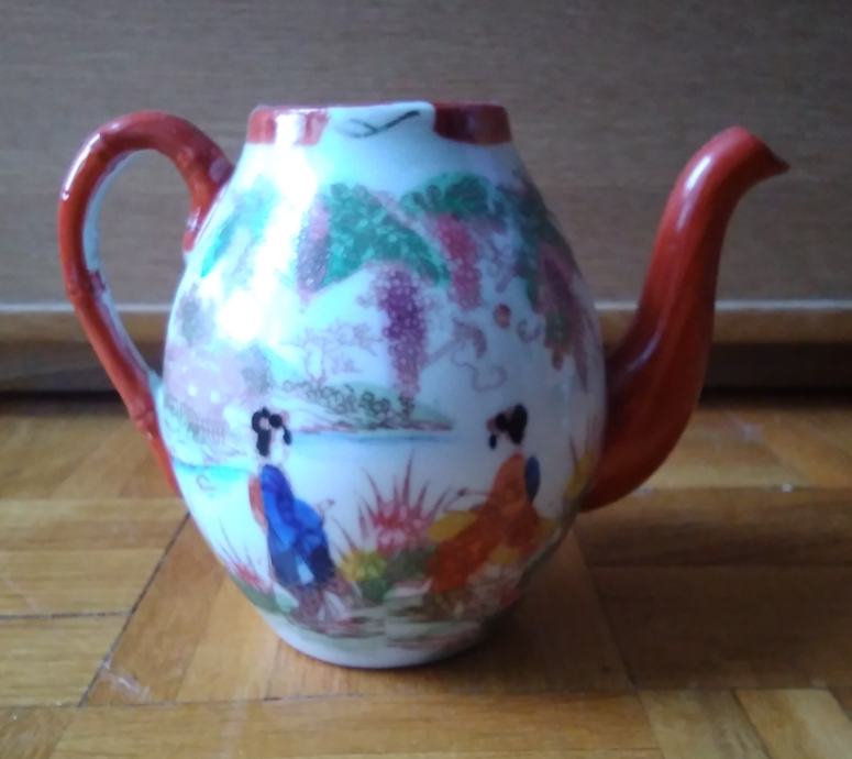 AI: japanski čajnik u stilu "gejša" (Geisha Girl pattern porcelain), vjerojatno dio Kutani čajnog set, vrijeme vjerojatno 1930-te